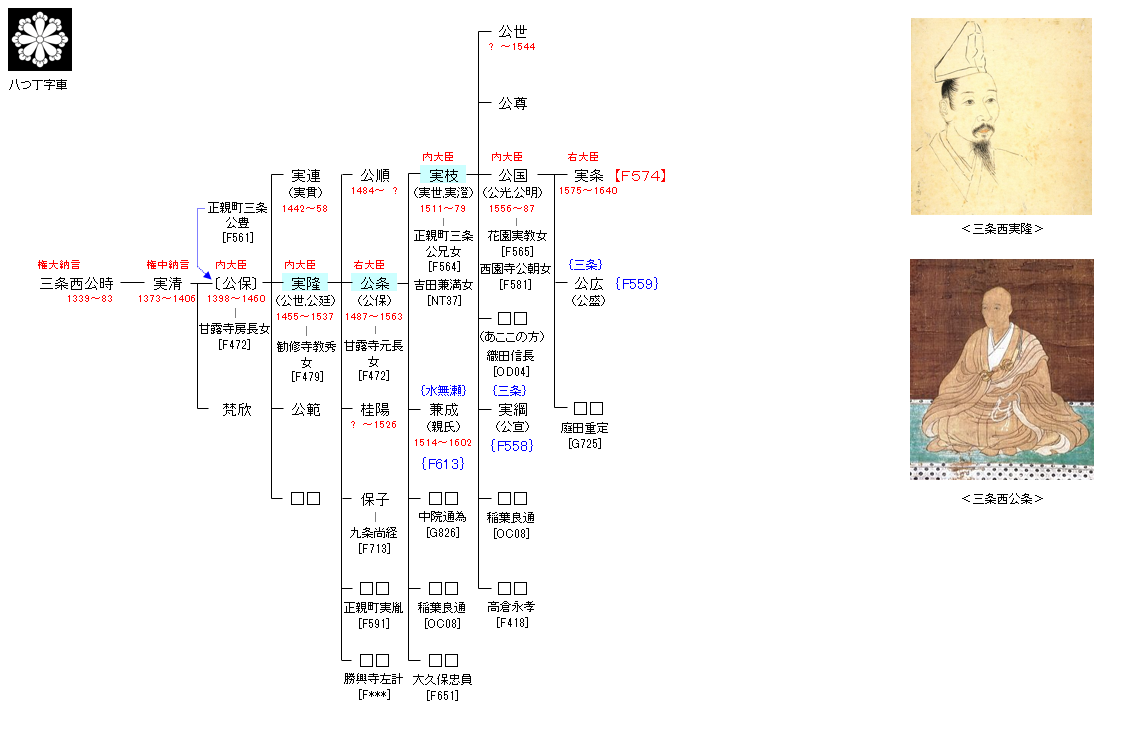 | F561:正親町三条公氏 | 藤原公季 ― 藤原公実 ― 三条公教 ― 正親町三条公氏 ― 三条西公時 | F573:三条西公時 |