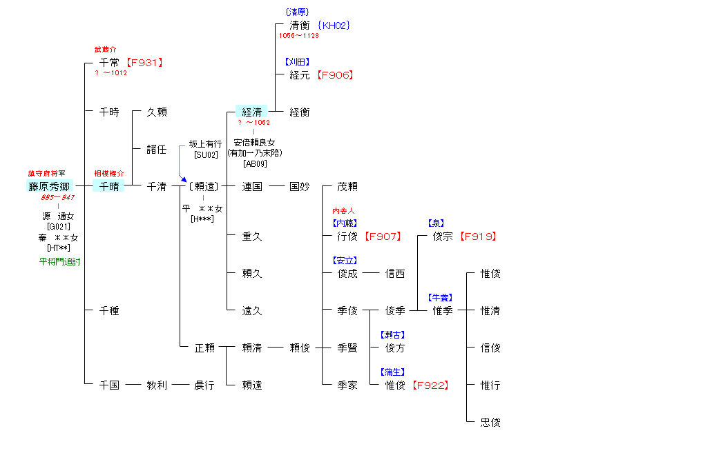 父・秀郷が平将門の乱で功績をあげたことにより朝廷で登用され京で活動する。康保4年(967年)、村上天皇の崩御の際、伊勢固関史を務める。東国で平義盛と争ったこともある。この間、相模介などを務めるが、安和2年(969年)に起きた藤原北家嫡流による他氏排斥事件である安和の変で対立する清和源氏の一族・源満季に追捕されて失脚、隠岐に流罪となった。以後の消息は不明。 |