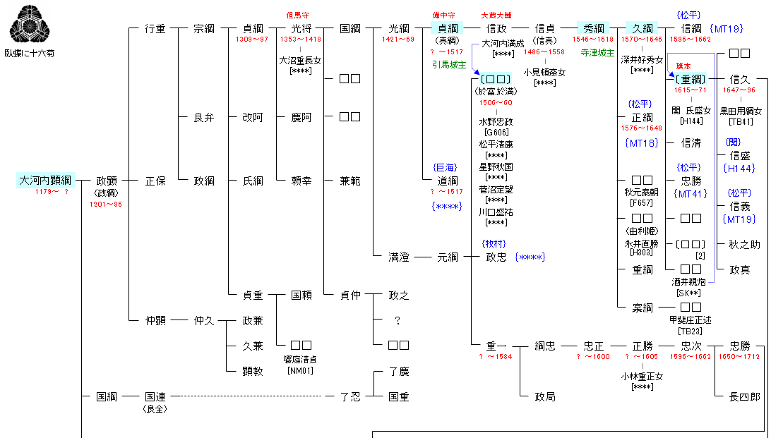 | G113:源 頼政 | 源 経基 ― 源 満仲 ― 源 頼光 ― 源 頼綱 ― 源 仲政 ― 源 頼政 ― 大河内顕綱 | G125:大河内顕綱 | ● |