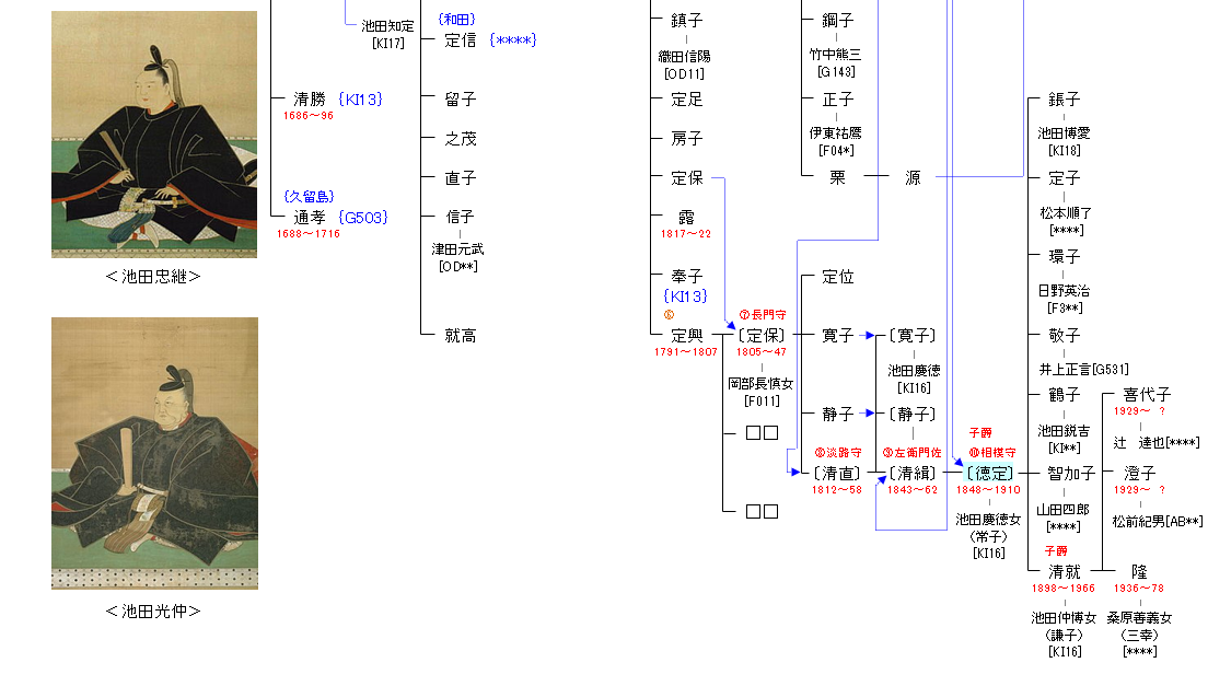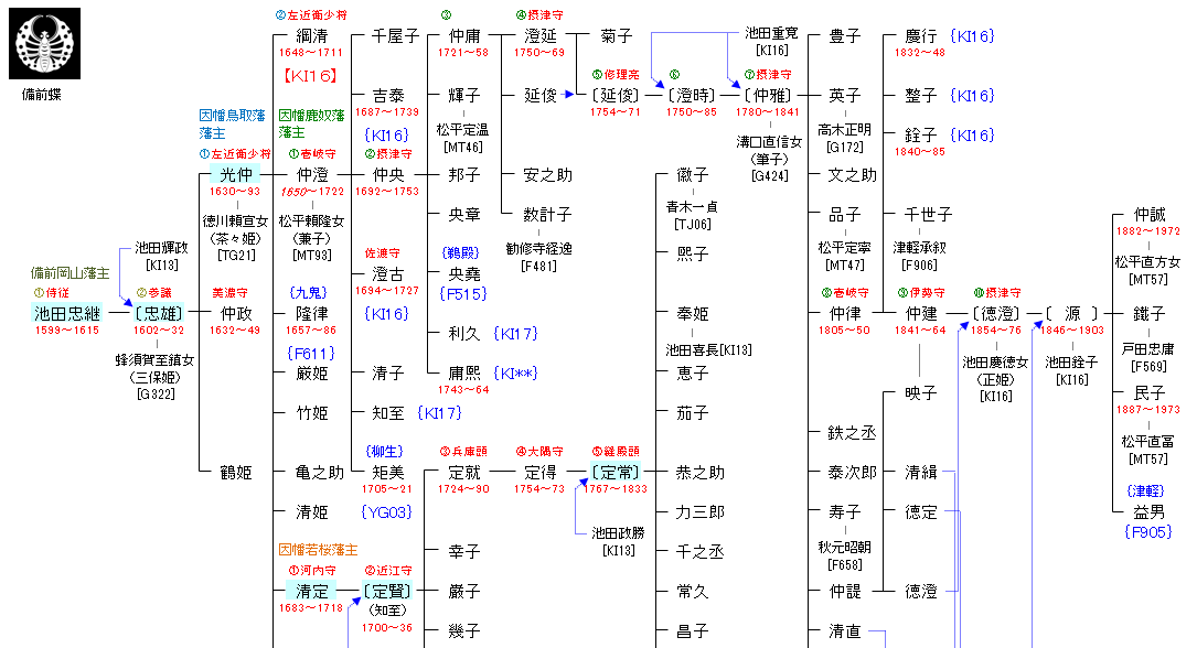 | KI13:池田輝政 | 池田維実 ― 池田奉永 ― 池田奉忠 ― 池田教正 ― 池田信輝 ― 池田輝政 ― 池田忠継 | KI15:池田忠継 |