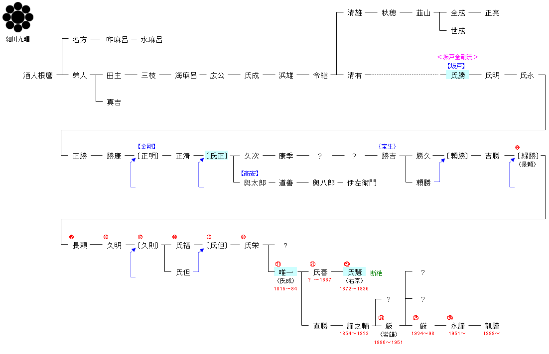| 法隆寺に仕えた猿楽座である坂戸座を源流とする流派で、室町初期の坂戸孫太郎氏勝を流祖とする。 | 豪快な芸風で知られ、「鼻金剛」の異名を取り、中興の祖とされる。 |