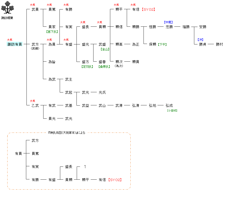 中世の伝承によると、諏訪明神(建御名方神)が8歳の童男に御衣を着せて自分の「御正体」として神格化させた。『諏方大明神画詞』(1356年)と『神氏系図(前田氏本)』(室町時代初期)によると、この男児は有員という名の人物という。 有員は桓武・平城朝(9世紀初頭)に生きたと言われていることから、桓武天皇の皇子とする伝承もあるが、史実性は疑わしい。一方、『阿蘇氏略系図(異本阿蘇氏系図)』と『神氏系図(大祝家本)』には、科野国造家出身の神子(くまこ)、または乙頴という人が用明天皇2年(587年)に諏訪湖の南に社壇を設けて初代大祝となったとあり、有員がその子孫とされている。この神子の母が洲羽君氏出身の弟兄部(乙比売)であった。須羽君氏は建御名方神の子・伊豆早雄命の後裔とされ、健隈照命の孫または曾孫である武河隈君が初めて洲羽君の氏姓を負ったとされる。洲羽君姓はその後、世襲され、歴代系図の最後に位置づけられる高嶺君まで君姓を名乗っていたことが『諸系譜』十三冊所載の「諏訪氏」に見られる。