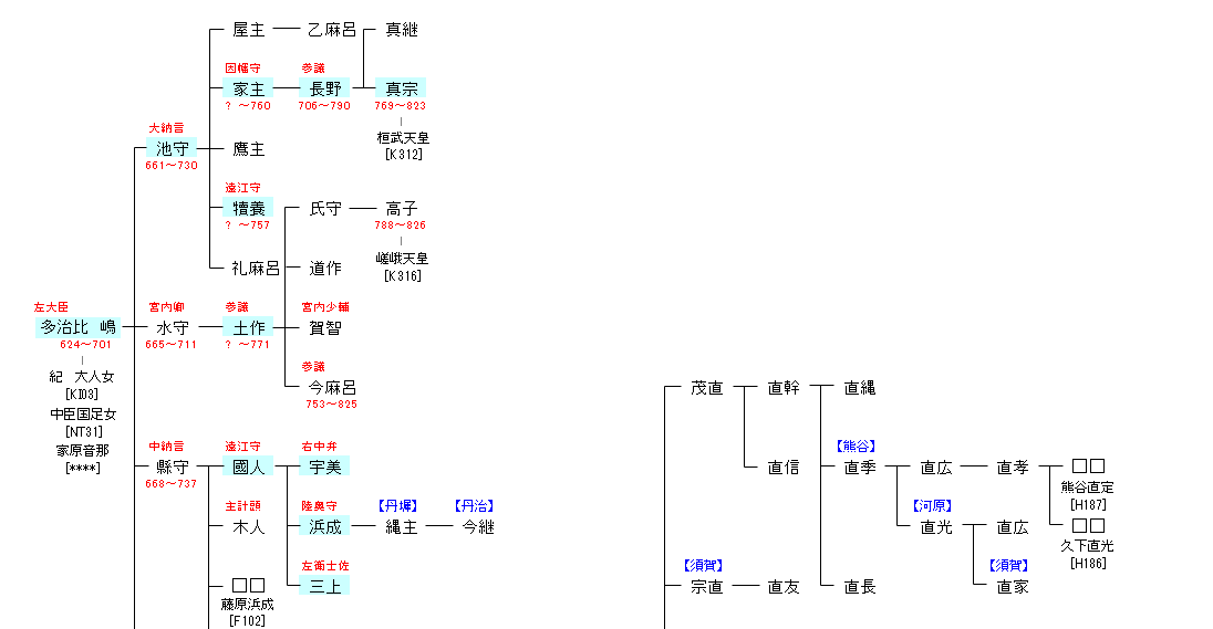 | K301:継体天皇 | 継体天皇 ―(宣化天皇)― 多治比 嶋 | TJ01:多治比 嶋 |