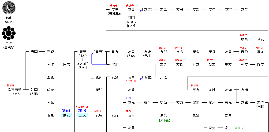 惟宗姓執印氏初代・康友の2男の友久は、国分寺沙汰職(留守職)並びに天満宮別当職に補任され、水引城(国分城)に居城して国分氏を称する。15代・友積に至り、天正15年(1586年)豊臣秀吉の侵攻に伴い鹿児島に移り、以後、鹿児島に居住する。 |