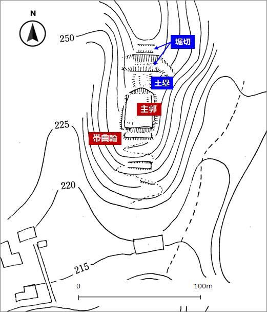城は興ヶ原集落の北に迫る丘陵上に位置し、方形単郭の城郭で主郭の北に尾根を切る大小2本の堀切と土塁があり、主郭南・西側には帯曲輪と思われる平坦部がある。