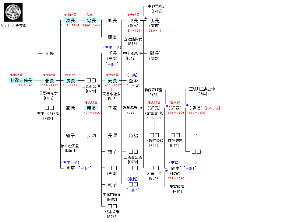 | F471:吉田為経 | 藤原高藤 ― 甘露寺為輔 ― 藤原宣孝 ― 坊城為房 ― 吉田経房 ― 吉田為経 ― 甘露寺藤長 | F472:甘露寺藤長 |