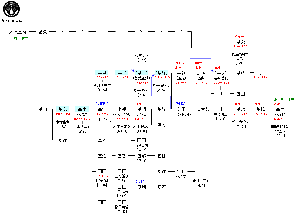 | F768:持明院基宗 | 藤原道長 ― 藤原頼宗 ― 藤原俊家 ― 持明院基家 ― 持明院基宗 ― 大沢基秀 | F770:大沢基秀 | ● |