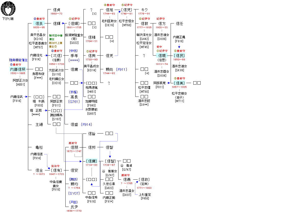 | F914:内藤信成 | 藤原魚名 ― 藤原秀郷 ― 内藤行俊 ― 内藤重清 ― 内藤信成 ― 内藤信照 | F915:内藤信照 | ● |