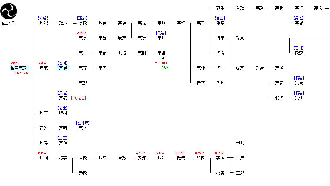 第一次皆川氏は長沼時宗の子・宗員が、寛喜年間に下野国皆川荘に拠点を構えたところに始まり、続くこと6代にして、宗常が元亨3年(1323年)に鎌倉幕府執権・北条高時に背いて自害し、所領を没収されて断絶した。その後、長沼氏秀の代から皆川に本拠を定め、氏秀の子・宗成が皆川氏を称し、この宗成が戦国大名・皆川氏の初代に数えられている(第二次皆川氏とされる)。 |