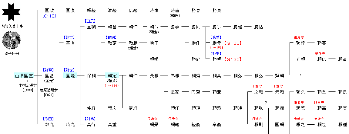 | G109:源 頼綱 | 源 経基 ― 源 満仲 ― 源 頼光 ― 源 頼綱 ― 山県国直 | G129:山県国直 |
