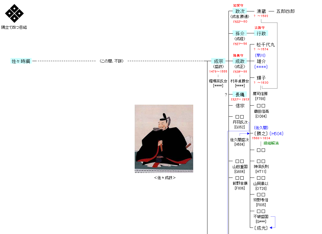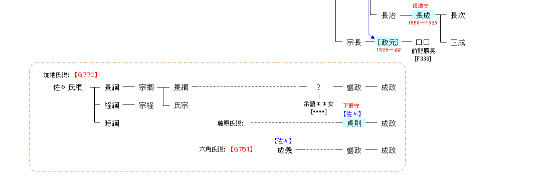 G751:六角泰綱 | 源 雅信 ― 源 扶義 ― 佐々木定綱 ― 佐々木信綱 ― 六角泰綱 ― 佐々時綱 | G773:佐々時綱 | ● |