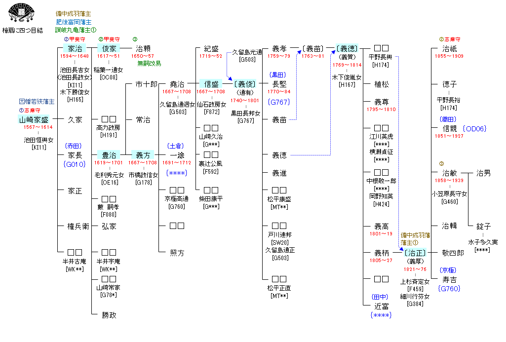 | G787:山崎憲家 | 源 雅信 ― 源 扶義 ― 佐々木行定 ― 山崎憲家 ― 山崎家盛 | G788:山崎家盛 | ● |