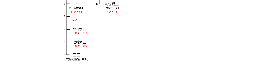 | K501:光厳天皇 | 後鳥羽天皇 ― 土御門天皇 ― 後草深天皇 ― 光厳天皇 ― 後花園天皇 | K602:後花園天皇 |