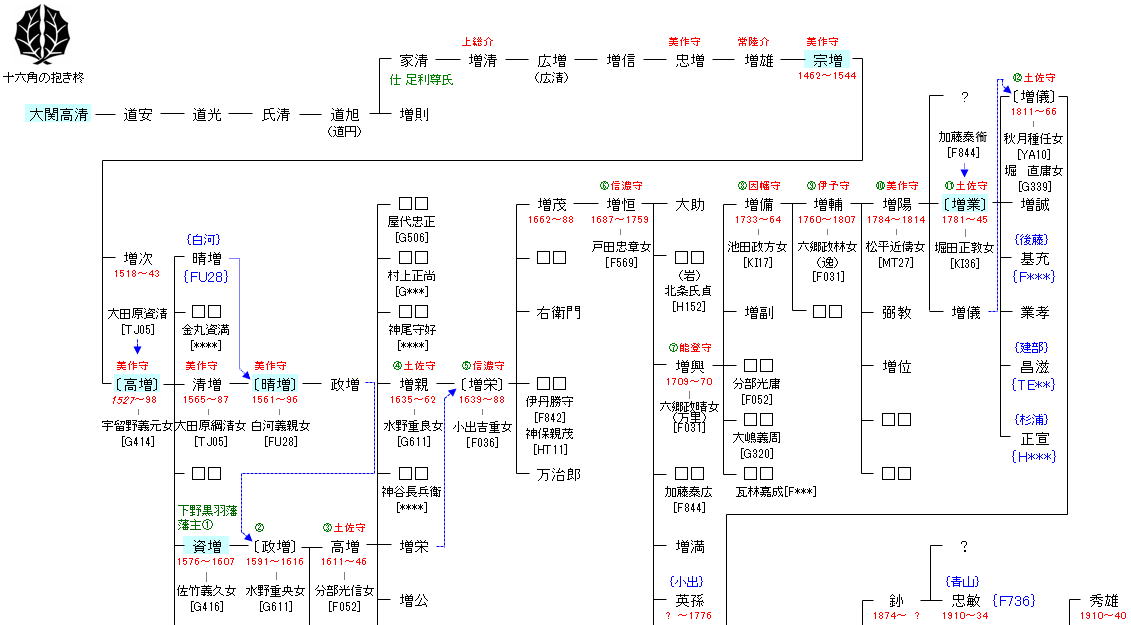 | TJ02:多治武綱 | 継体天皇 ―(宣化天皇)― 多治比 嶋 ― 丹治武綱 ― 大関高清 | TJ07:大関高清 | ● |