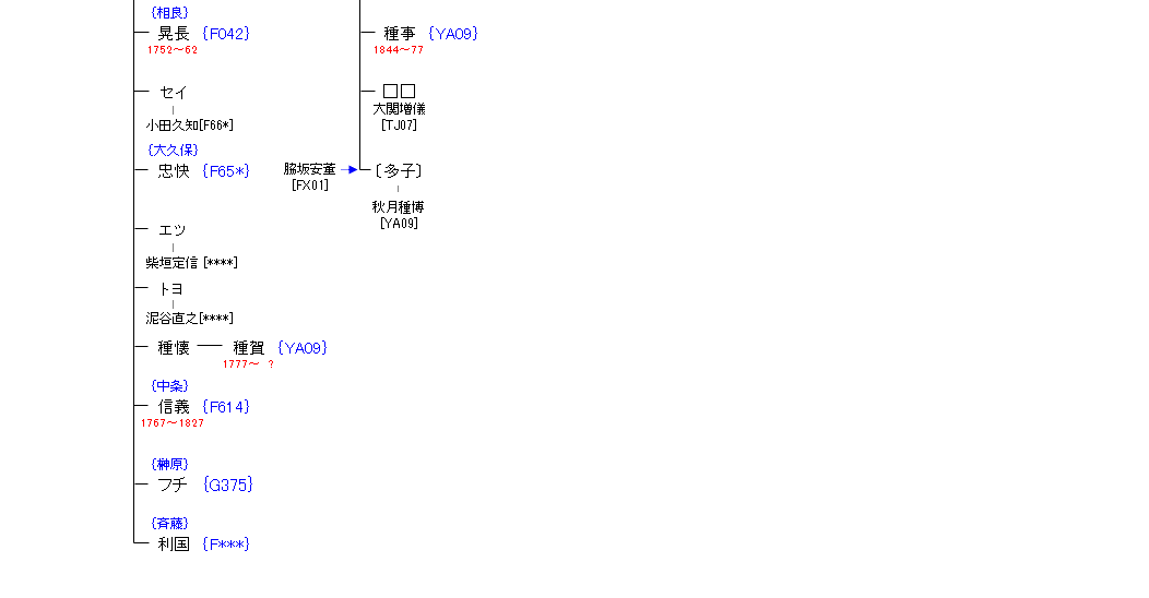 | YA09:秋月種長 | 東漢 掬 ― 東漢爾波伎 ― 大蔵広隅 ― 大蔵種資 ― 原田種直 ― 秋月種雄 ― 秋月種長 ― 秋月種美 | YA10:秋月種美 | ● |