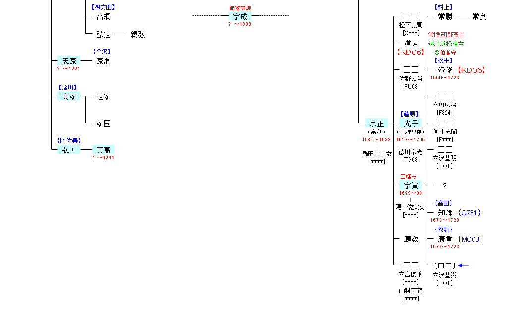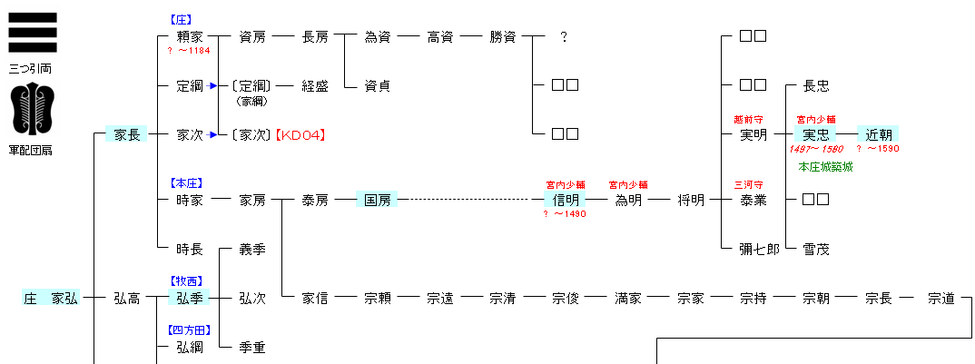 | KD02:児玉弘行 | 大部豊日 ― 大部船瀬足尼 ― 児玉惟行 ― 児玉弘行 ― 庄 家弘 | KD03:庄 家弘 |