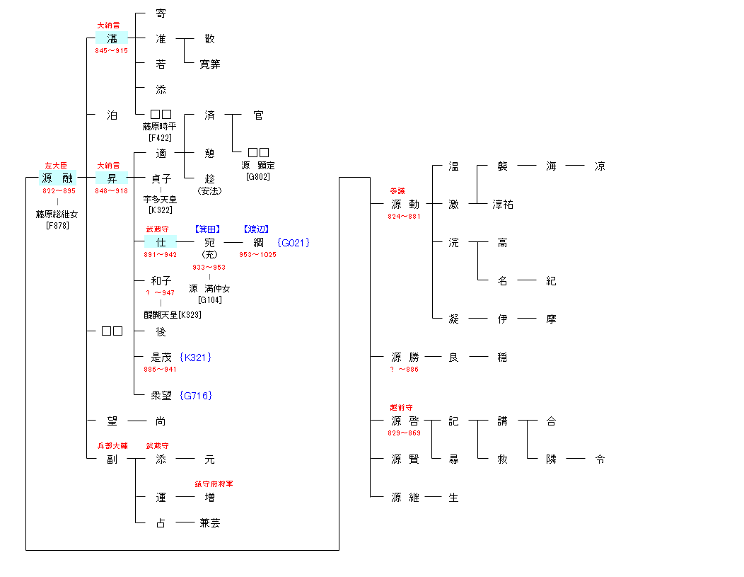 平安時代前期の公卿。貞観5年(863年)に無位から従五位下に叙位され、その後、備後権介,右近中将,蔵人頭,内蔵頭などを歴任して寛平5年(893年)参議となる。更に延喜8年(908年)従三位中納言となり、同13年(913年)大納言になったが、翌年致仕して延喜15年(915年)5月21日薨去した。早く死別した妻・藤原氏のために七七日修功願文、亡父融の周忌法会願文がいずれも『菅家文草』に収録されている。土御門大路北・木辻小路東に所在した宇多院は、もともとは湛の邸宅だったらしい。 |