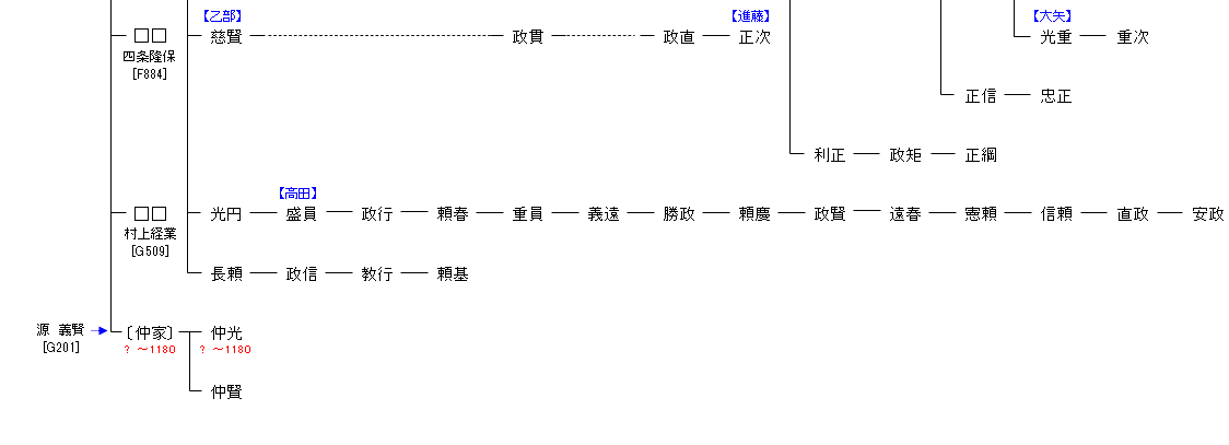 | G112:源 仲政 | 源 経基 ― 源 満仲 ― 源 頼光 ― 源 頼綱 ― 源 仲政 ― 源 頼政 | G113:源 頼政 |