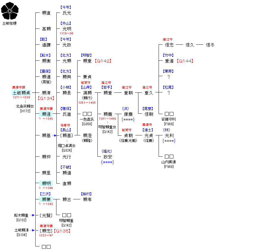 | G132:土岐光衡 | 源 頼光 ― 源 頼綱 ― 源 国房 ― 土岐光衡 ― 土岐頼貞 | G133:土岐頼貞 |