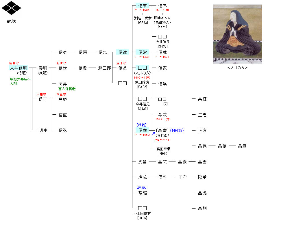 | G427:武田信光 | 源 経基 ― 源 頼信 ― 源 義光 ― 源 義清 ― 武田信義 ― 武田信光 ― 大井信明 | G436:大井信明 | ● |