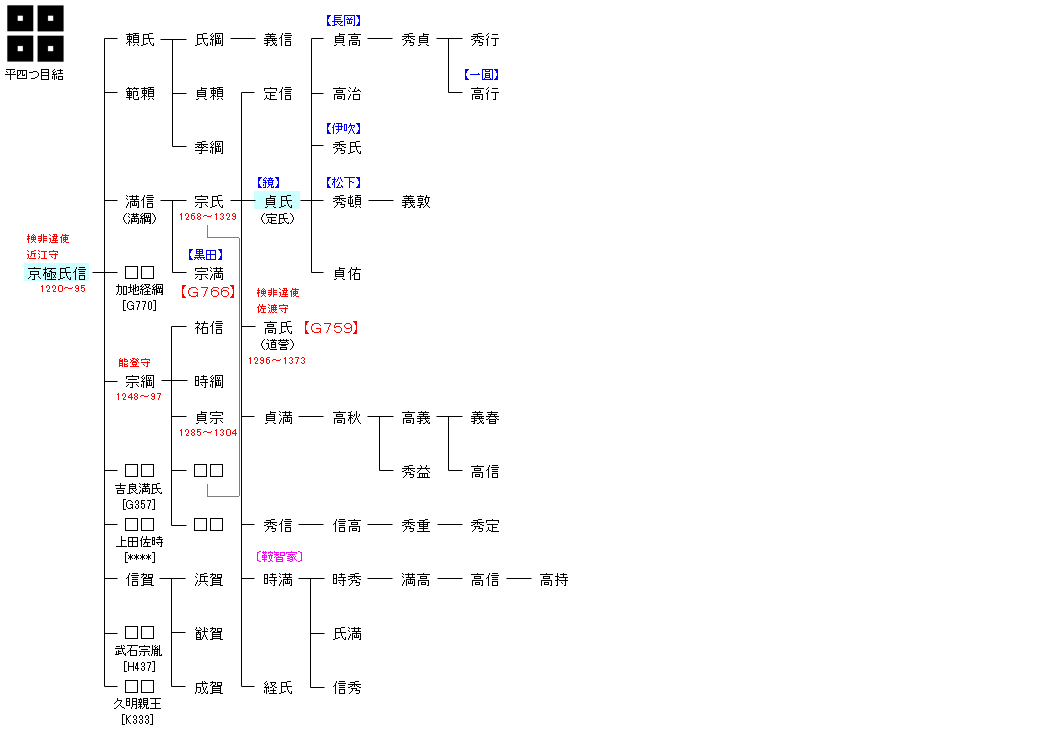 | G743:佐々木信綱 | 源 雅信 ― 源 扶義 ― 佐々木定綱 ― 佐々木信綱 ― 京極氏信 | G758:京極氏信 |