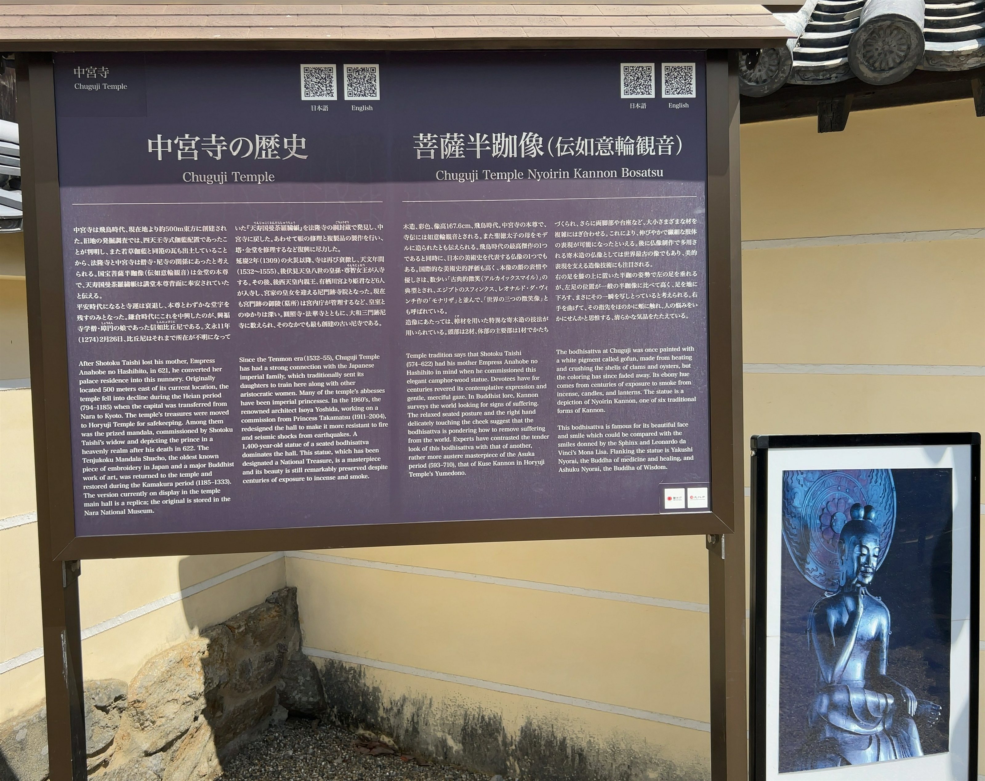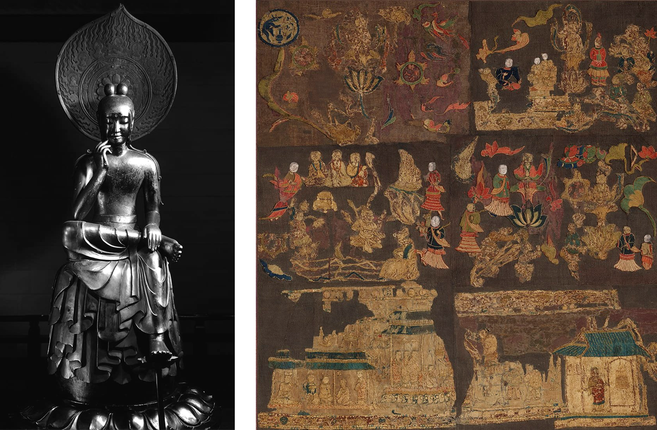 菩薩半跏像(寺伝・如意輪観音)と天寿国曼荼羅繍帳(聖徳宗 中宮寺 公式ホームページより引用)