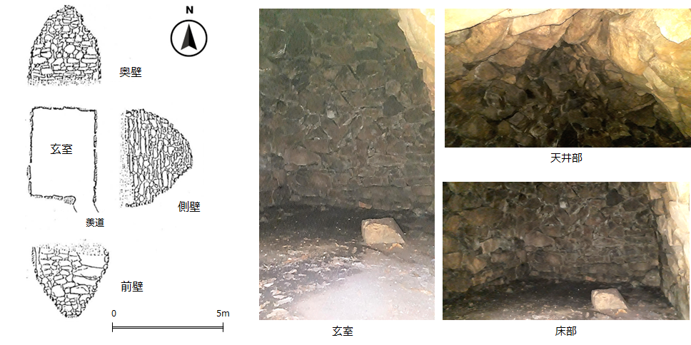 石室は朝鮮半島の影響も考えられ、小さな石材をドーム状に積み上げており、天井石に相当するものがない。玄室の床面付近では四角ははっきりしているが、天井に近づくにつれて角が取れ、最上部では丸くなっている。 この石積み方式は北九州の初期の石室の特徴をもっており、近畿地方では珍しく、奈良県の指定史跡となっている。