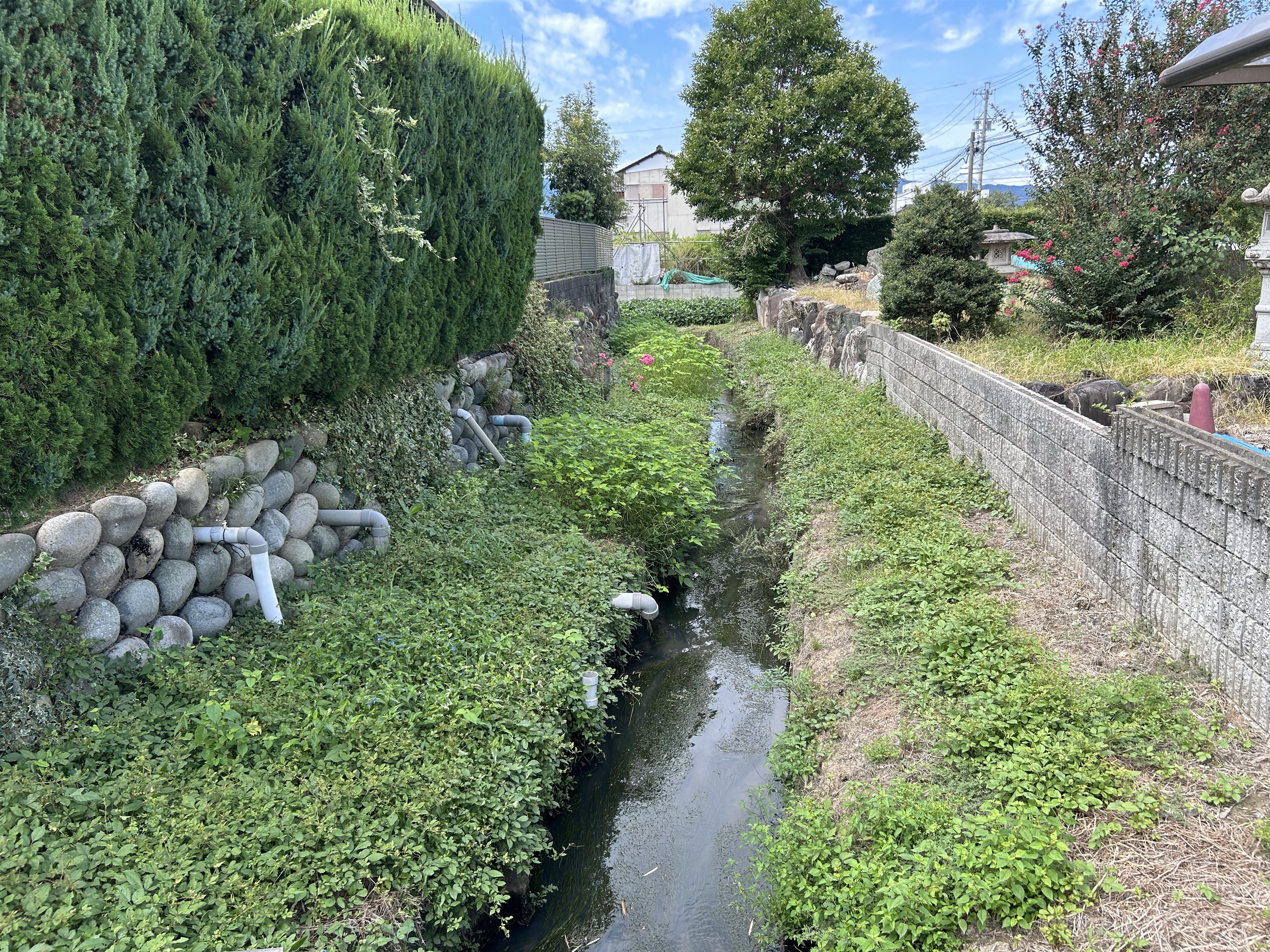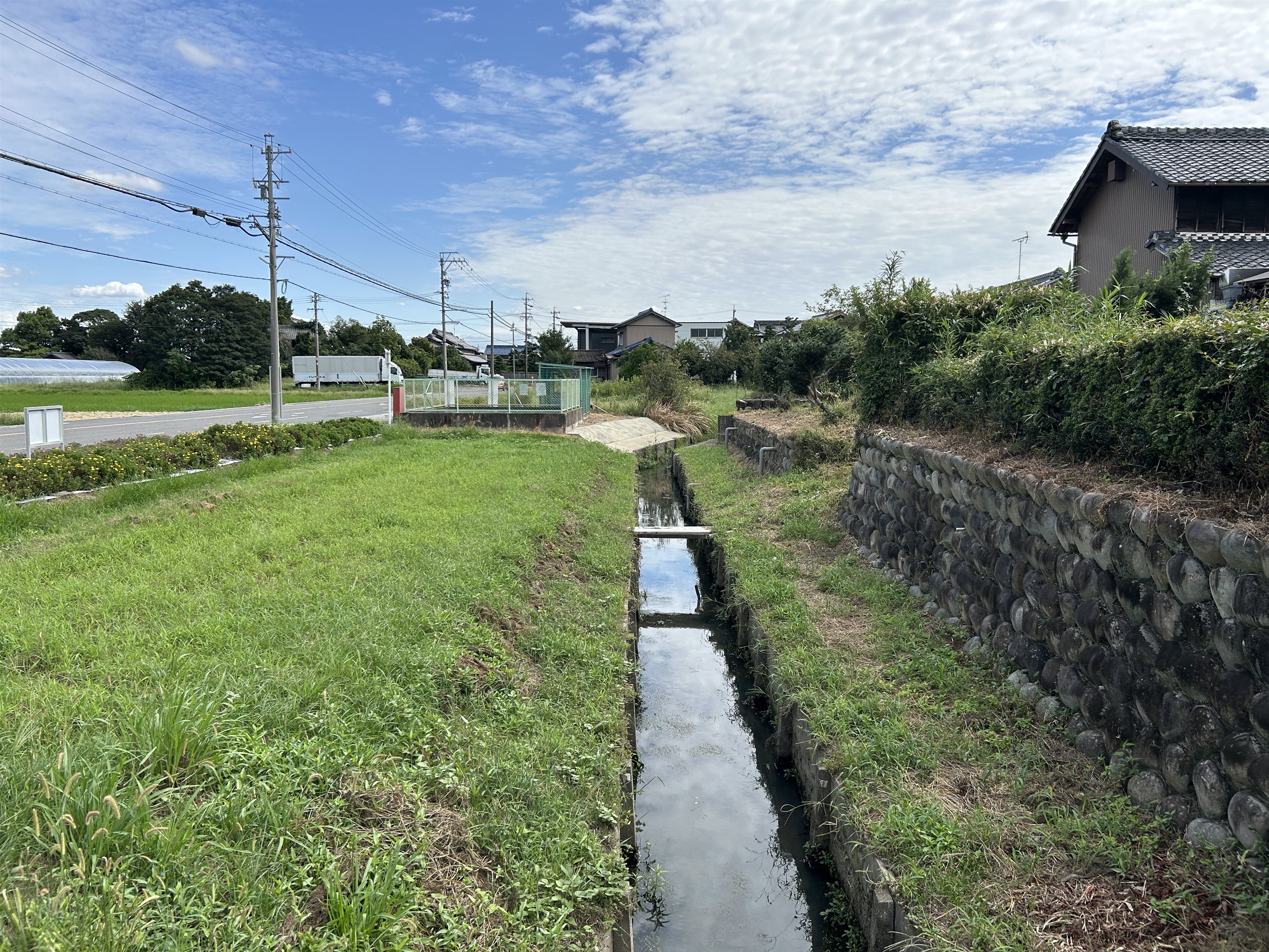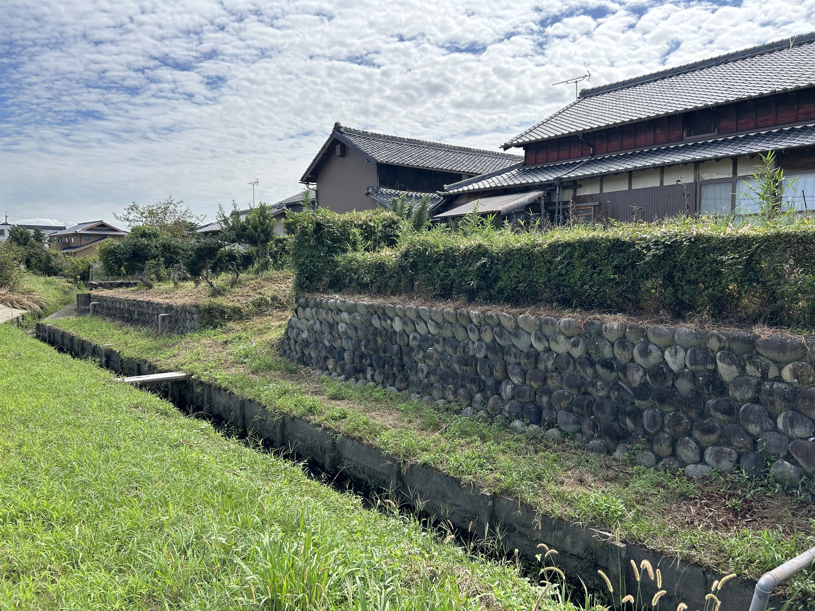 現在は住宅に変わっているが、家屋は石積みの高い位置にあり、前方には堀跡の一部だったと思われる水路が通っている。