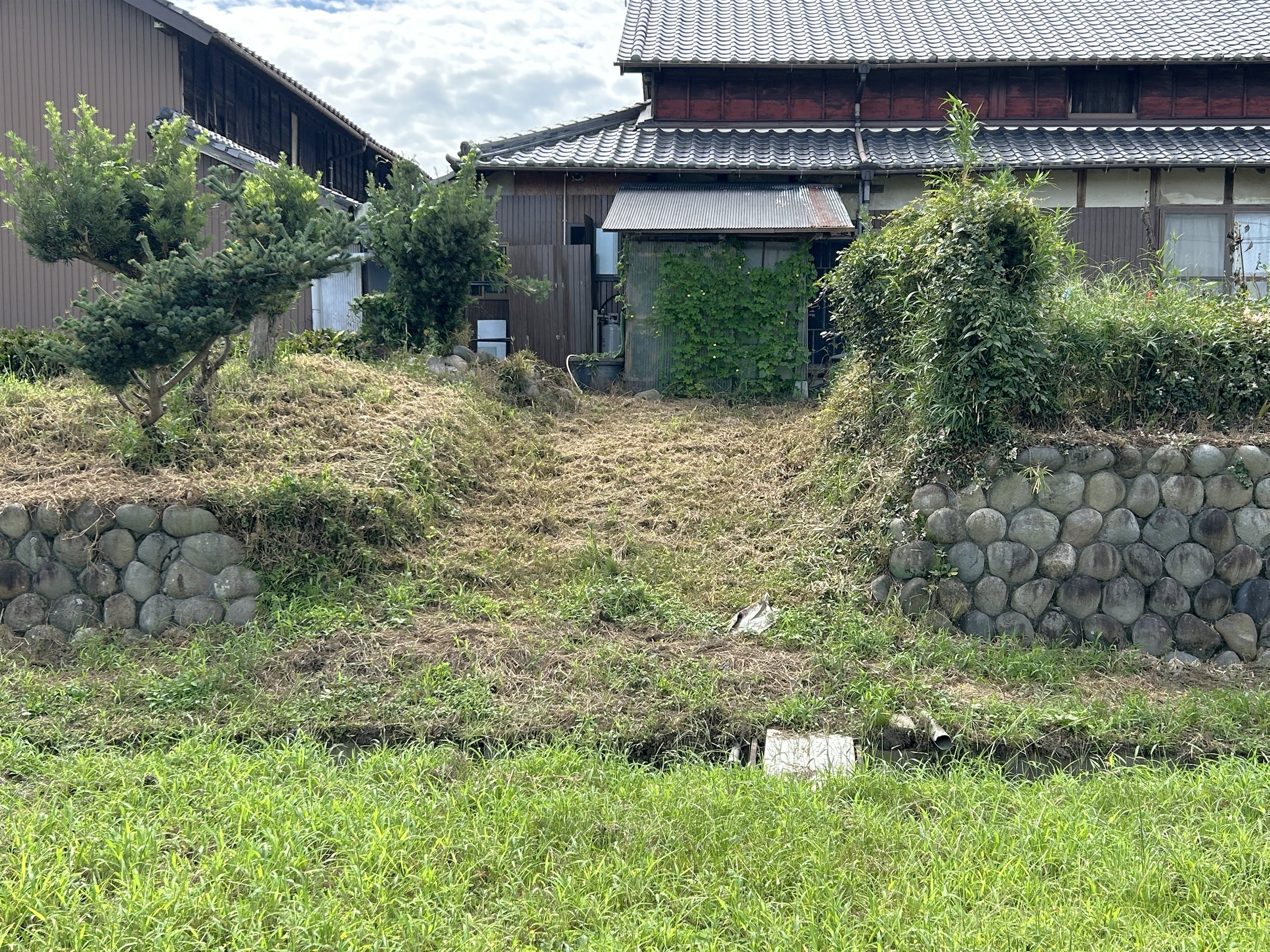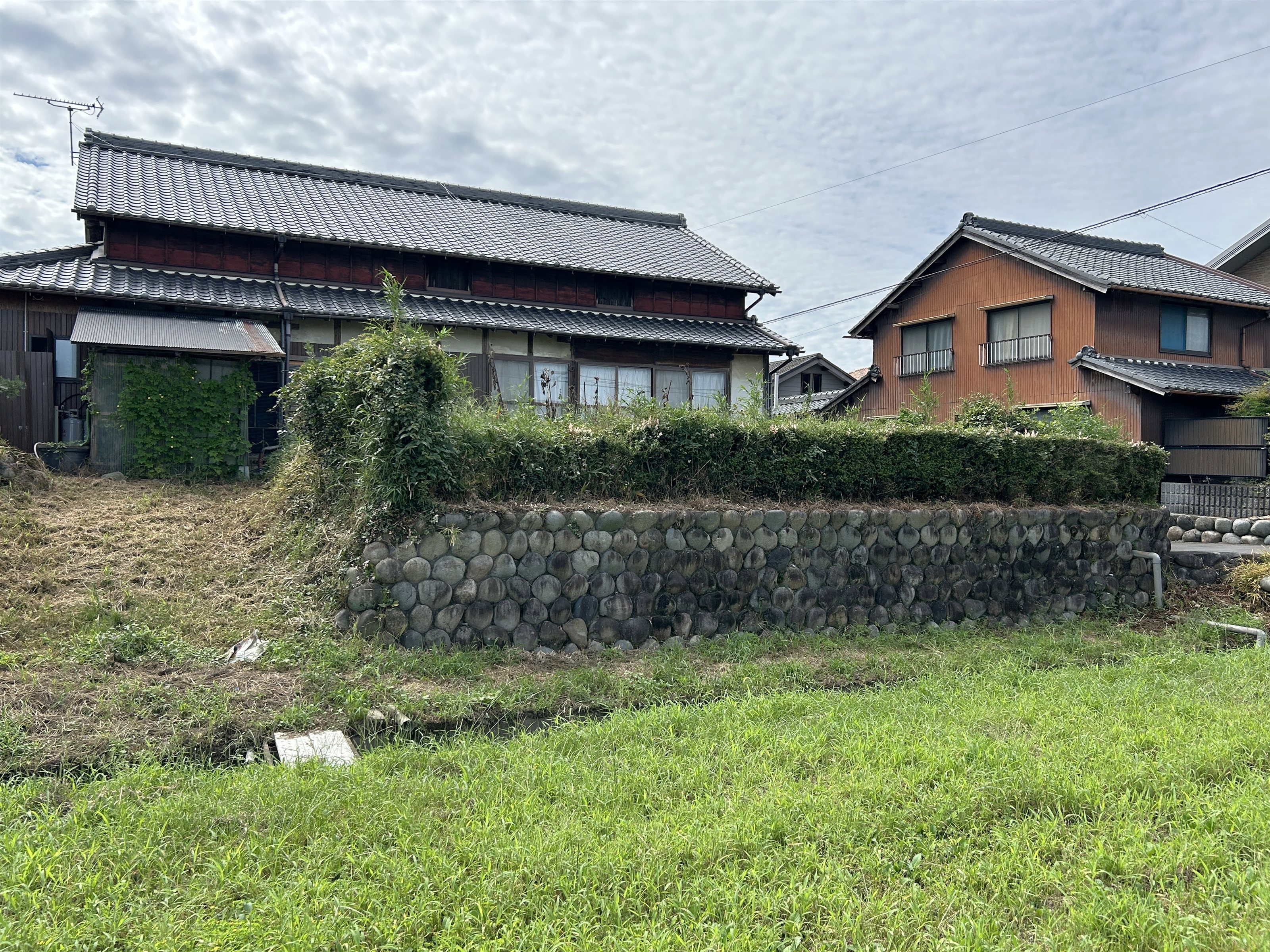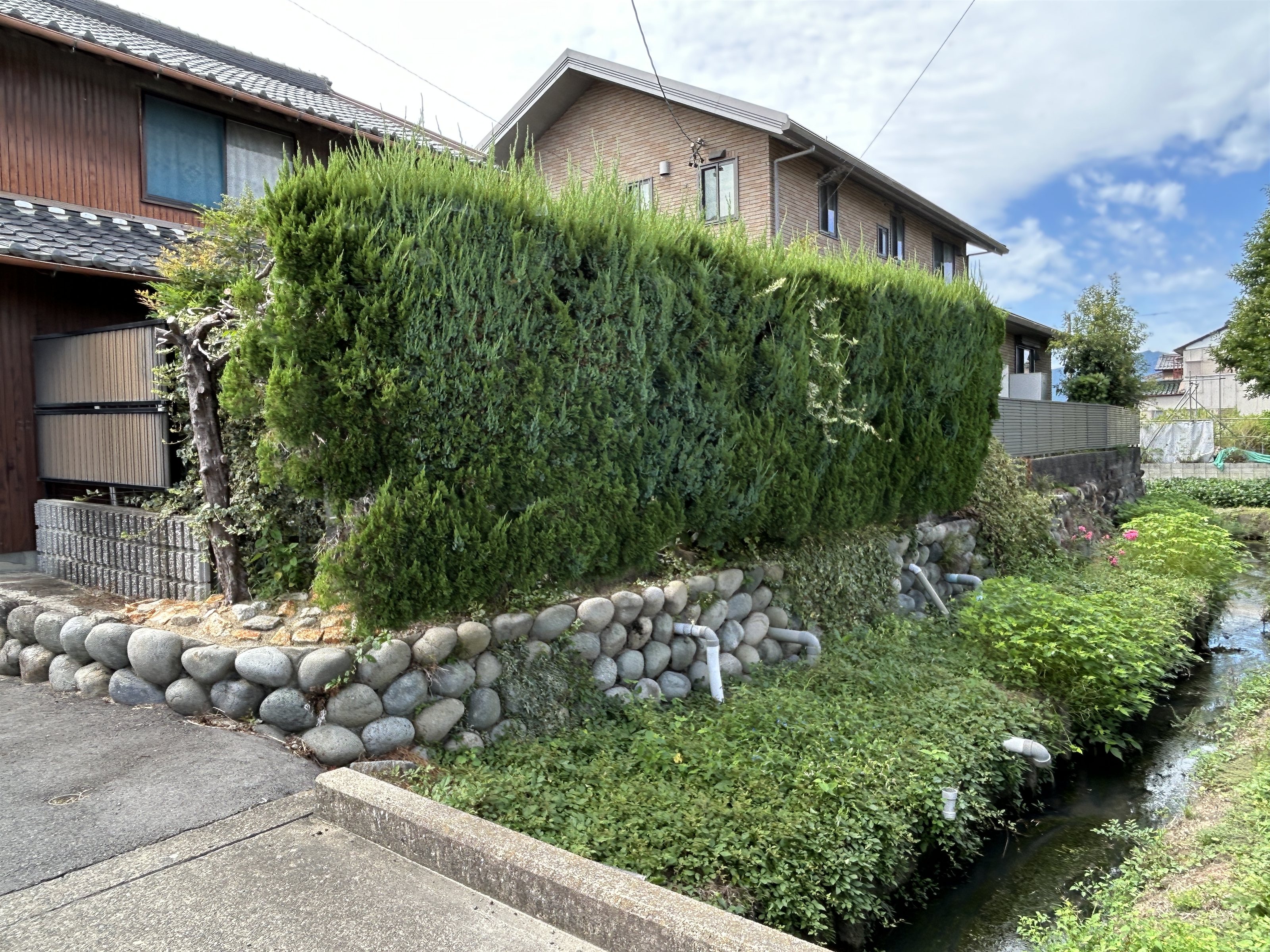 現在は住宅に変わっているが、家屋は石積みの高い位置にあり、前方には堀跡の一部だったと思われる水路が通っている。