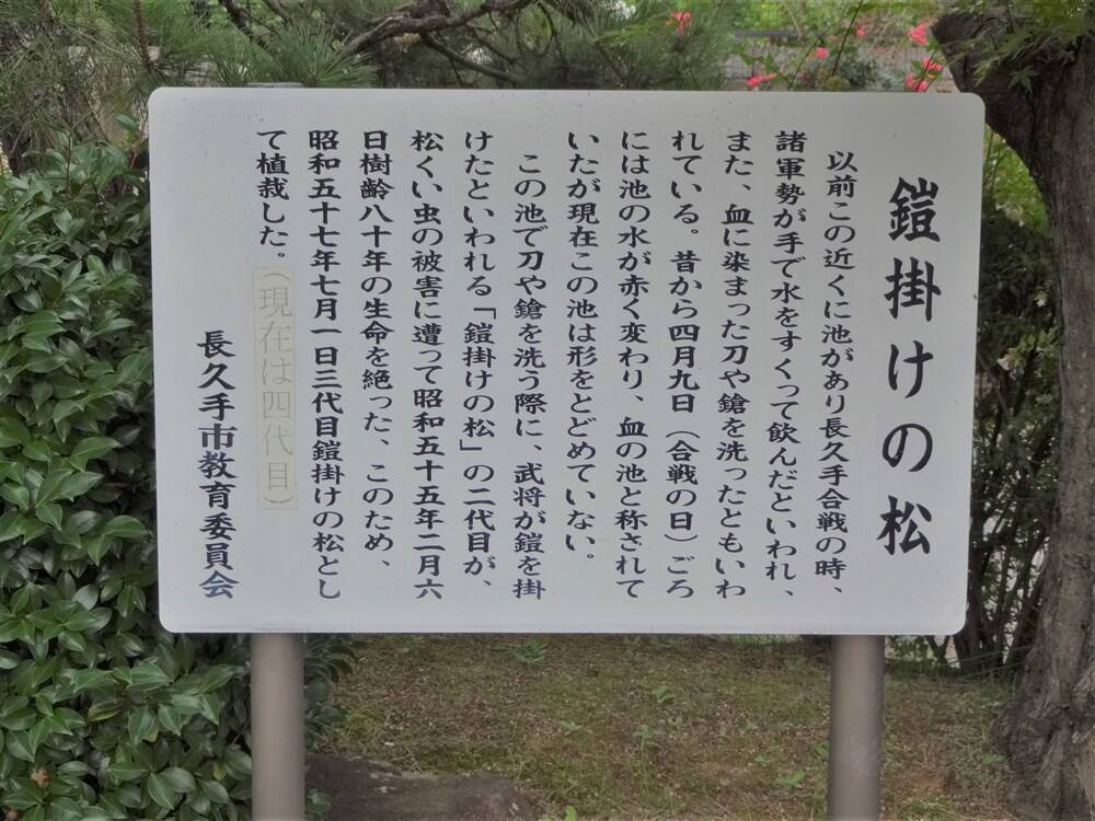 1584(天正12)年4月9日の長久手仏ヶ根の決戦で勝利した徳川軍が血の付いた刀や槍を「血の池」で洗うときに鎧(甲冑)を掛けた松である。現在の松は、戦国時代から続く松ではなく4代目。