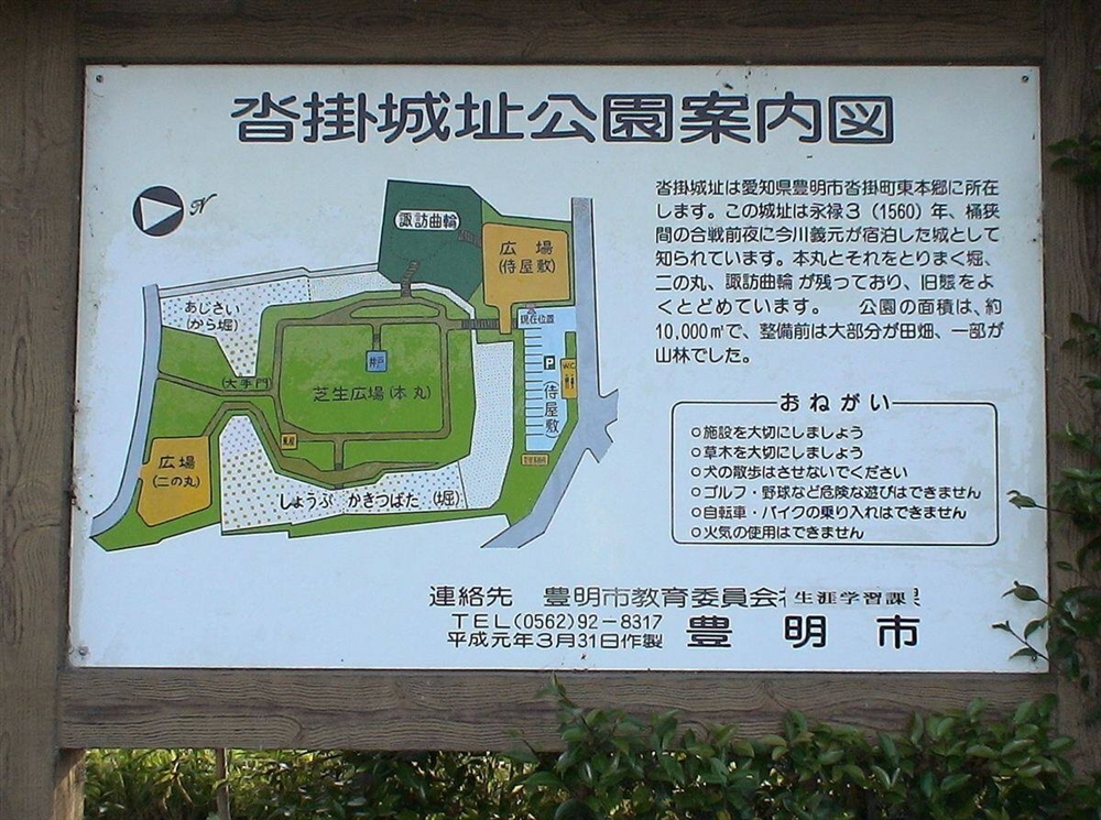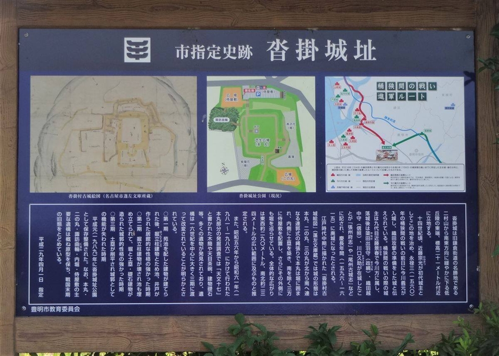 1560(永禄3)年、約1万(諸説あり)の大軍を率いた今川義元は、5月18日に池鯉鮒を出立して沓掛城に入り、ここで軍評定を行ったとされる。翌19日朝、義元本隊約5,000は沓掛城を出発して桶狭間に入ったが、織田軍2,000の奇襲攻撃で総大将の義元が討たれ総崩れとなる。21日、沓掛城は織田勢の城攻めにより落城、城主・近藤景春は討死した。戦後、桶狭間の戦いで勲功一番と称された簗田出羽守広正が城主となったが、1575(天正3)年に加賀天神山城主となって去り、その後は織田信照,川口宗勝が城主を務めた。