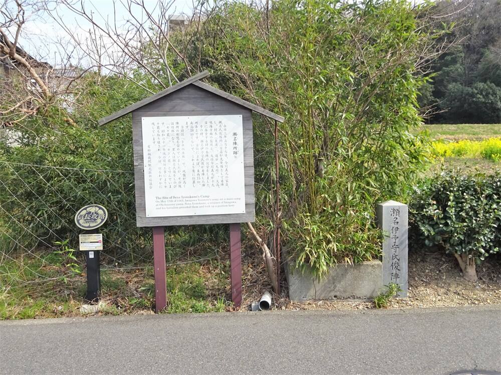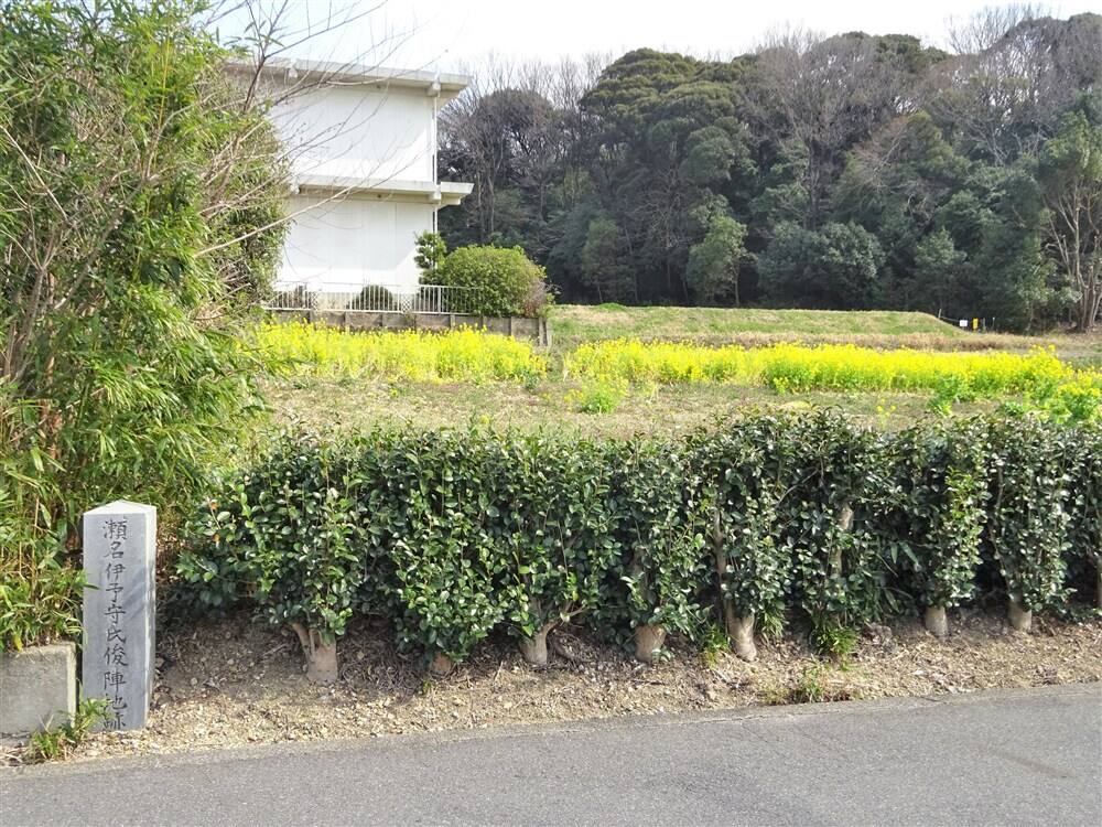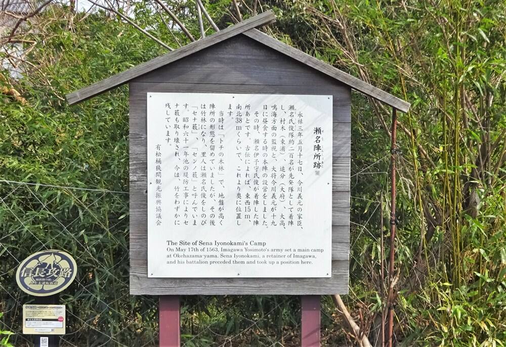 1560(永禄3)年5月17日、桶狭間の戦いの2日前に今川義元の本陣設営のために瀬名氏俊の先発隊約200が着陣した所。義元が19日に昼食をとるおけはざま山本陣の設営のほか、村木(東浦町),追分(大府市),大高,鳴海方面の監視を行った。19日の桶狭間の戦いの際には、瀬名氏俊は大高城に向かっていたため、戦死を免れた。 陣所はこれより奥の東西約15m,南北約38mの高所にあったとされる。現在、遺構は残されていない。