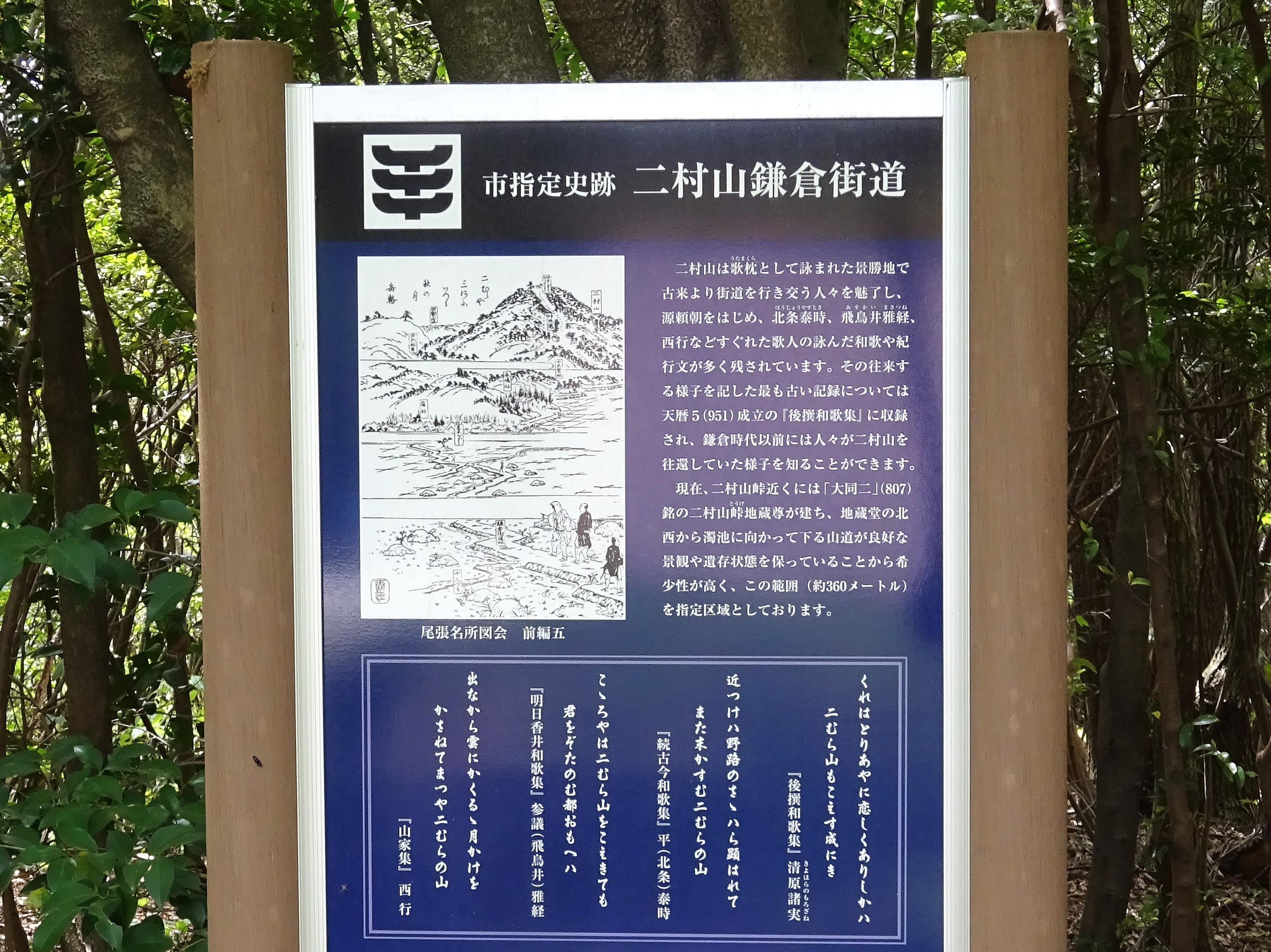 平安時代から鎌倉,室町時代を経て、1601(慶長6)年に徳川家康が東海道を制定し伝馬の制度が定まるまでの京都と鎌倉を結ぶ主要幹線道路である。熱田,呼続,古鳴海,相原を経て二村山を通り、宿,十三塚,大久伝,西境,駒場を経て八橋に至る。鎌倉街道の跡とされる道は、昭和初期まではその経路をたどることができたが、宅地造成や土地改良事業によってそのほとんどが失われた状態となっており、現在では二村山の山頂近くにある地蔵堂の北西から濁池(藤田医科大学の北西)に向かって下る山道が唯一、往時の道影を残している。