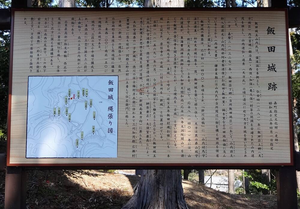 今川義元が桶狭間に倒れると、1568(永禄11)年には三河の徳川家康が遠江に侵攻する。遠江の国人衆が続々と家康に降るなか、山内通泰は家康に降ることなく敵対していたため、1569(永禄12)年6月、家康は榊原康政,大須賀康高らに飯田城を攻めさせ、山内通泰は討死して落城した。1572(元亀3)年には、武田信玄の軍勢によって攻め落とされ天野氏が入ったが、約5年ののちに徳川氏が再び奪還し、そのまま廃城となった。