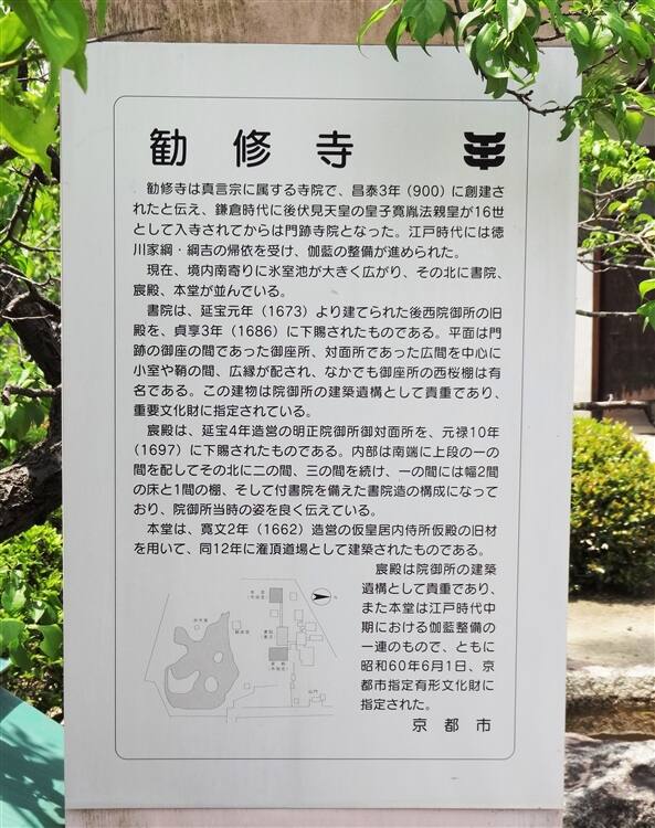 代々、法親王が入寺する宮門跡寺院として栄えたが、1470(文明2)年に応仁の乱の兵火で焼失し、さらに豊臣秀吉が伏見街道を造る際に境内地を削減され、氷室池の南側を埋め立てられるなどして次第に衰退した。江戸時代に入って、徳川家と皇室の援助により復興された。現存する本堂,宸殿,書院等の伽藍は、霊元天皇,明正天皇などの旧殿を下賜されたものである。また、30世・尊孝法親王の叔母にあたる真宮理子が将軍・徳川吉宗の正室であった縁で、紀伊国の約100ヶ寺が勧修寺の末寺となった。幕末の32世・済範入道親王は後に還俗して山階宮晃親王となっている。