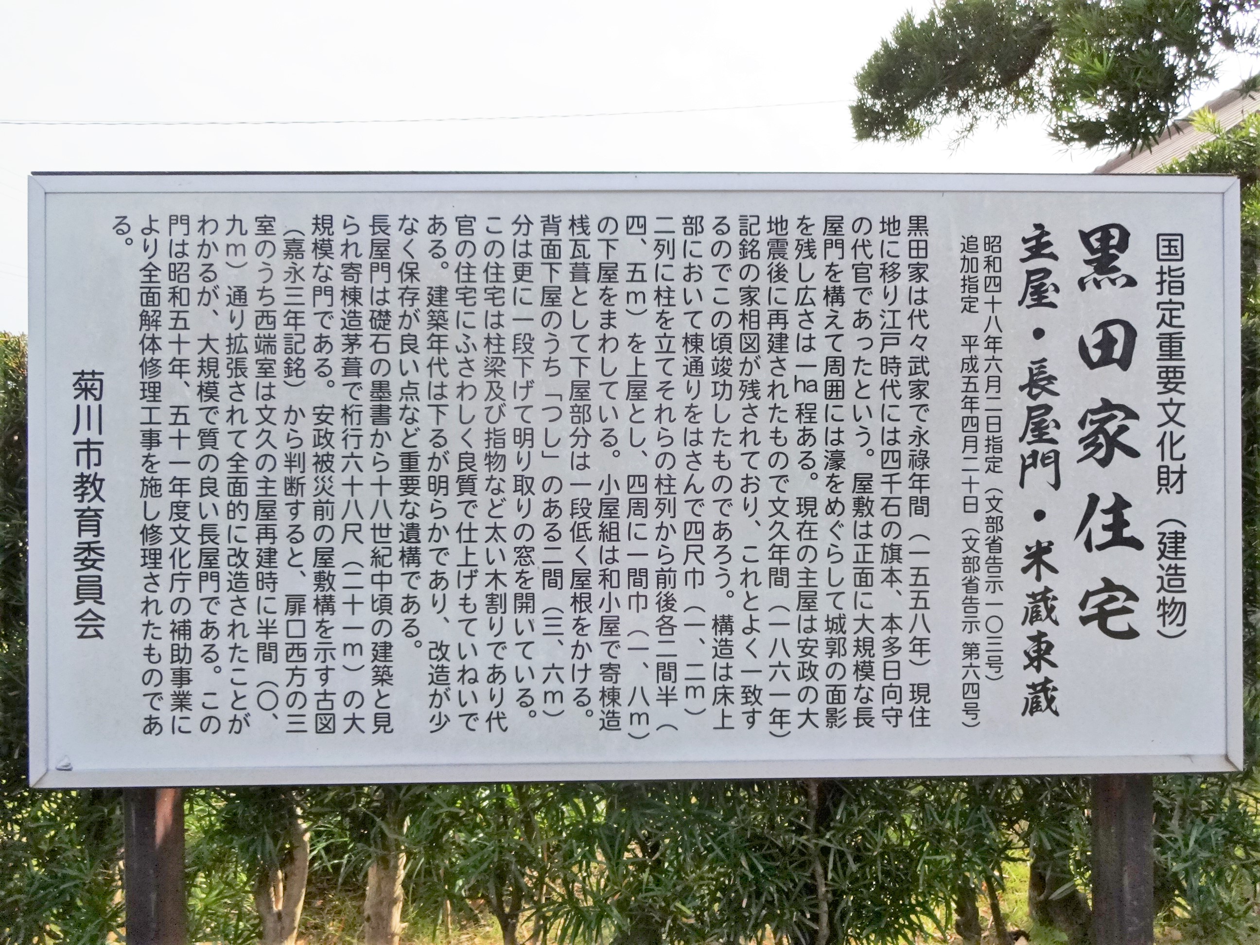 徳川家4千石の旗本で当地を治めた本多助久の代官となった黒田家が築いた屋敷である。黒田家が当地に住したのは永禄年間(1558~69年)とされ、黒田義則が現在地に縄張りを行い居住したのが始まりと伝わる。
