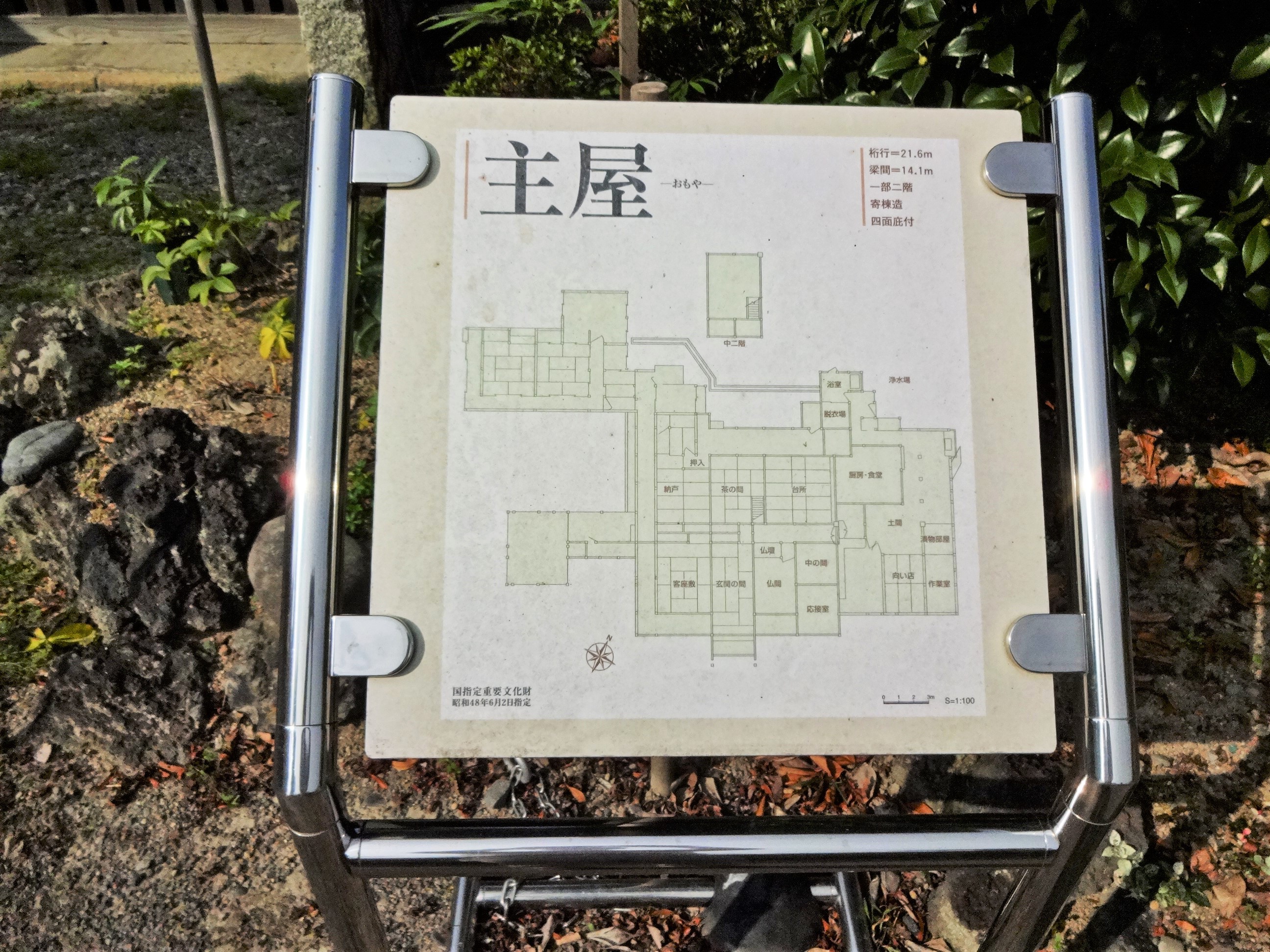 宅地は南北約100m,東西約80mで周囲に濠をめぐらし、南に長屋門を開き、その東脇に米蔵が建つ。門の北側の敷地ほぼ中央に主屋が建ち、その背後に東蔵,西蔵が並んで建つ。