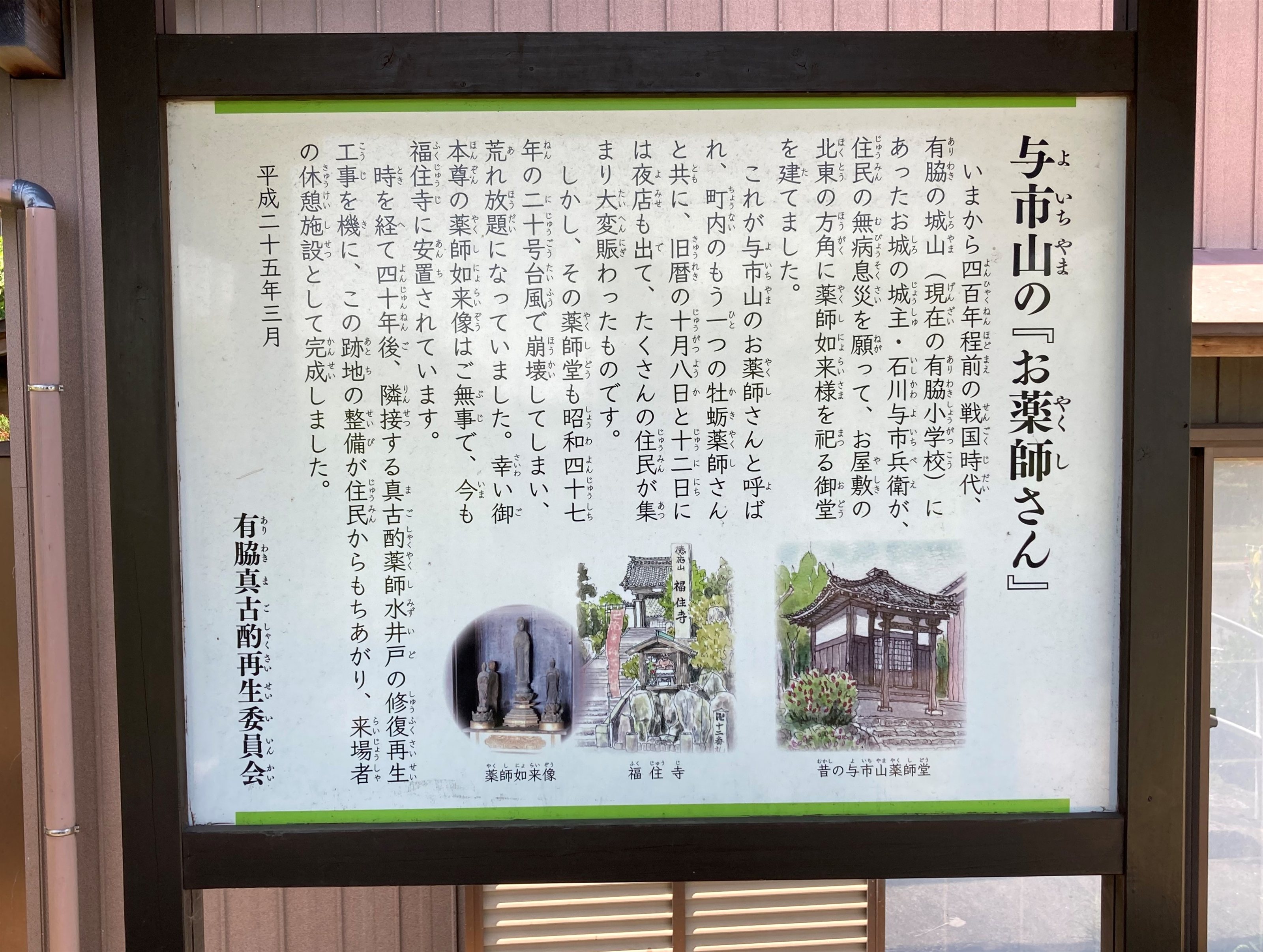1543(天文12)年、水野宗家の家督を継いだ緒川城主・水野信元(於大の方の兄)が、尾張国知多半島統一をめざし成岩城攻略のため築いた城砦で、石川與市郎に守備させた。有脇城は標高17m,比高10mの「城山」と呼ばれる丘陵に築かれていたが、現在は有脇小学校となり遺構は残されていない。城跡の北には城砦を築いたときに鎮護として福住村(知多郡阿久比町)から移した福住寺(当初は修験宗喜蔵院という)がある。 また、城跡の南東には清水が湧き出る「真古酌の薬師水」がある。