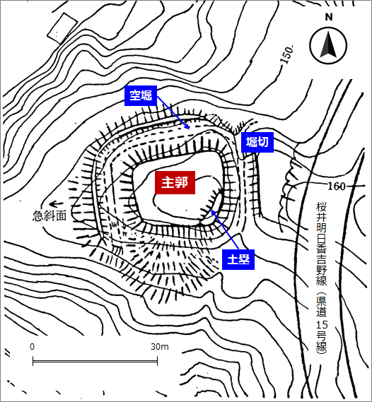 築城時期,築城者については不明である。岡寺に連なる丘陵の先端部に築かれた城で、主郭の三方を空堀で囲い、東側には堀切を設けている。また、主郭の南東部には土塁がみられる。