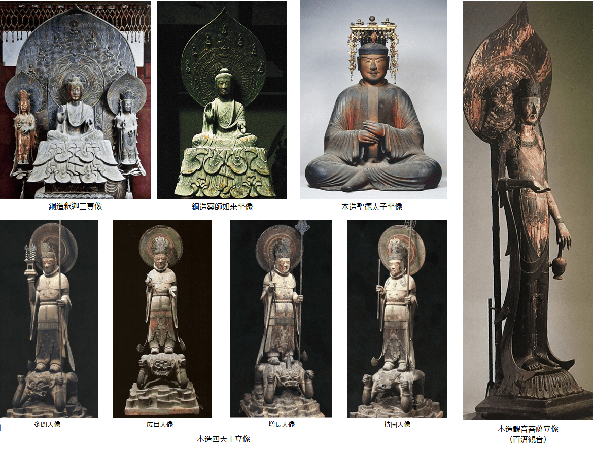 【指 定】・国指定史跡:法隆寺境内(1951年6月9日指定) ・世界遺産:法隆寺地域の仏教建造物の一部(1993年12月9日登録) 【国 宝】・金堂:入母屋造の二重仏堂 ・五重塔:木造五重塔として現存世界最古 ・大講堂:925年に焼失後の990年に再建 ・木造薬師如来及両脇侍坐像:大講堂に安置 ・銅造釈迦如来及両脇侍像:金堂に安置 ・銅造薬師如来坐像:金堂に安置 ・木造四天王立像:金堂に安置 ・木造毘沙門天立像,吉祥天立像:釈迦三尊像の左右に立つ平安時代の木造彩色像 |