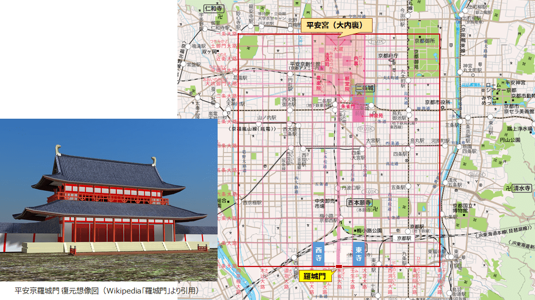 794(延暦13)年、平安京の京域南端中央に正門として設けられた羅城門の跡とされる。平安京の羅城門は、『拾芥抄』などでは桁行7間,梁間2間で二重閣とするが、裏松固禅の『大内裏図考証』では桁行9間とされている。