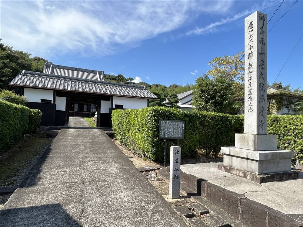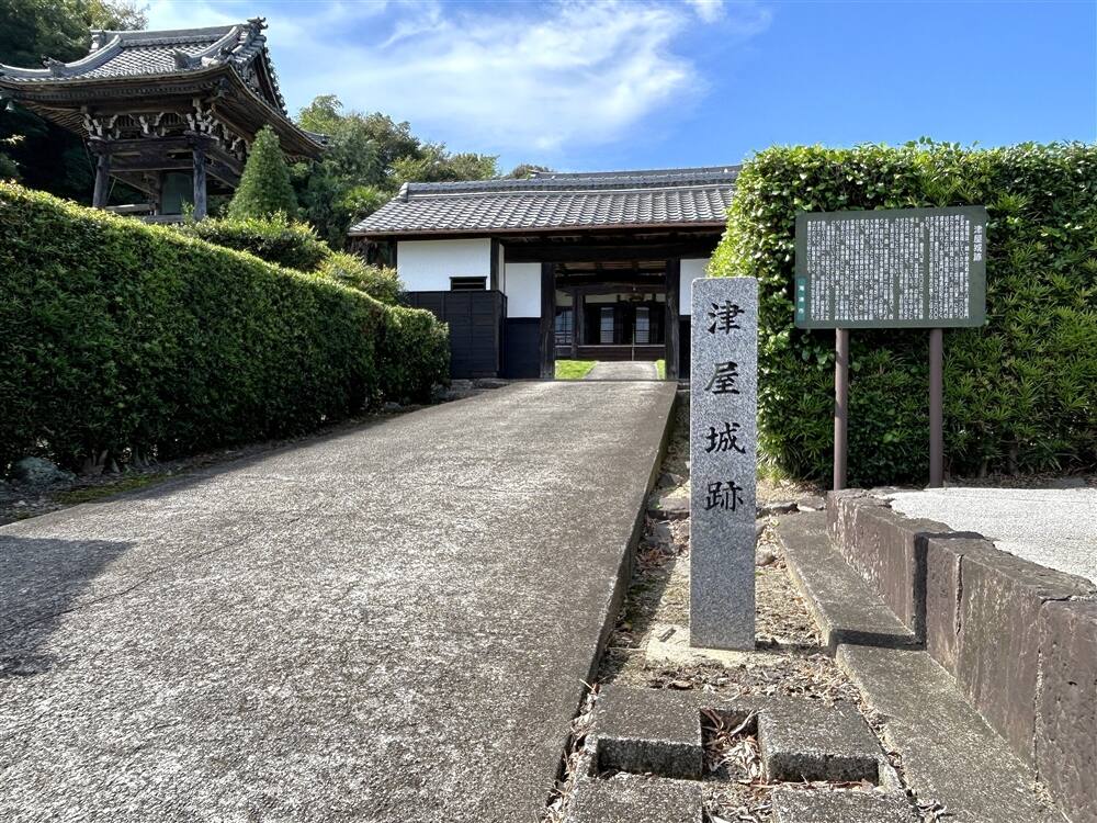 寺院の山門となっている長屋門は津屋城の城門を転用したものと伝えられている。また、境内(主郭部)の南側に長さ67m、西側に54mの鍵形をなす深さ2.3~3mの空堀が残されており、堀の内側には土塁がめぐらされている。特に西側は長さ33m,基底幅4m,高さ1~1.5m,馬踏幅1mでほぼ旧状をとどめている。