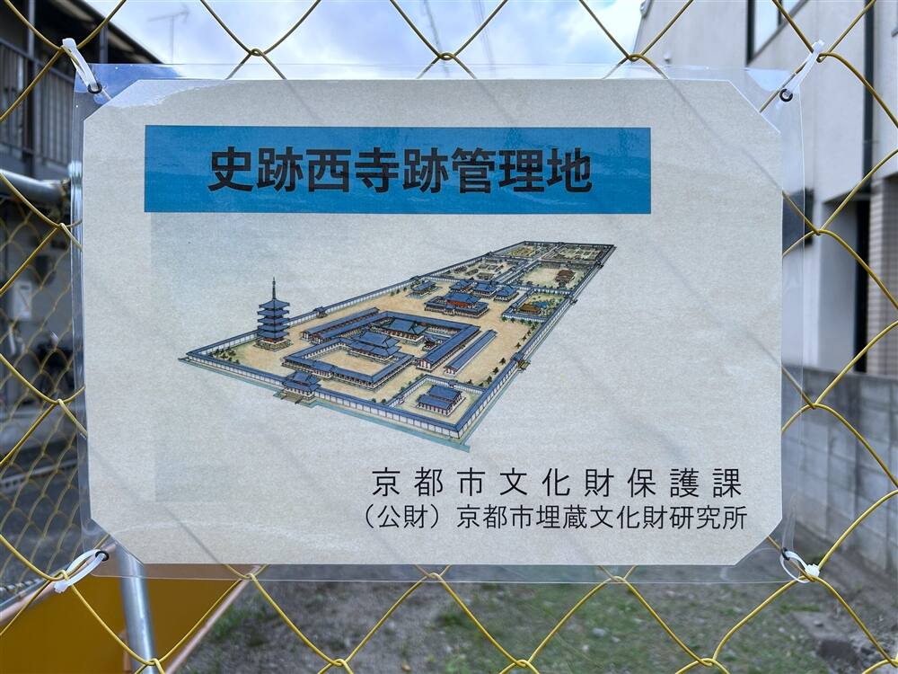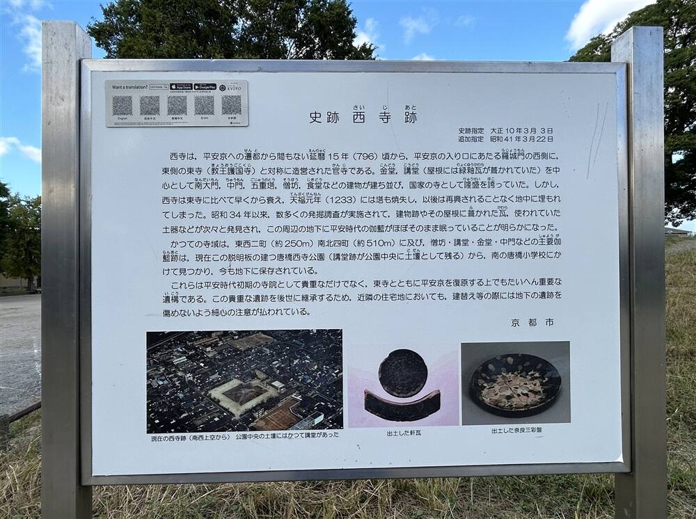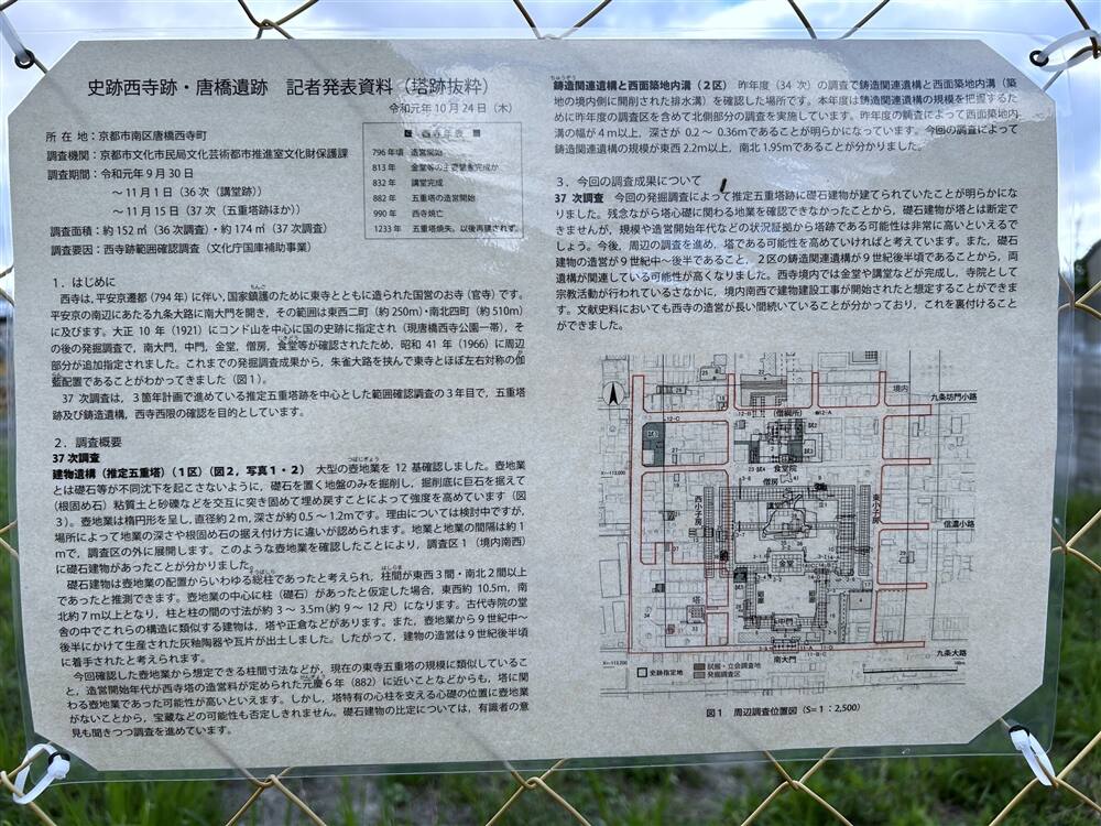 1959(昭和34)年からの発掘調査により、金堂,廻廊,僧坊,食堂院,南大門等の遺構が確認されている。なお、唐橋西寺公園の中央にある遺構は講堂跡とされる。史跡の範囲は、唐橋小学校敷地,唐橋西寺公園敷地,同公園以北・東寺通以南の民有地と、これらの西側の道路。公園の南西方向には五重塔があった(発掘調査中)。