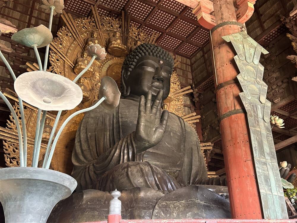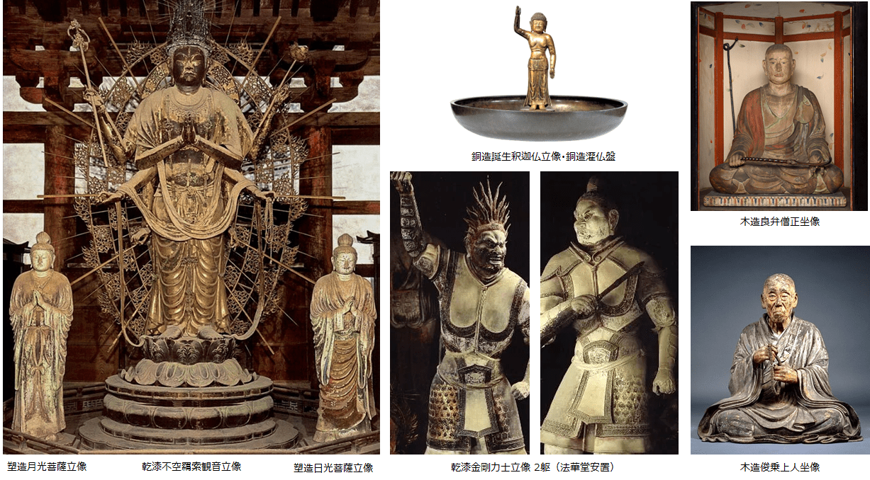 東大寺は正式には金光明四天王護国之寺ともいい、聖武天皇が国力を尽くして建立した寺である。開山(初代別当)は良弁。当初は、紫香楽宮の近くの甲賀寺に造られる計画であったが、不穏な出来事が続いたため、都も平城京へ戻すとともに、大仏も現在の地での造立が開始された。この大事業を推進するには幅広い民衆の支持が必要であったため、朝廷から弾圧されていた行基を大僧正として迎え、協力を得た。延べ260万人が工事に関わったとされる。開眼導師はインド出身の僧・菩提僊那が担当した。東大寺では大仏創建に力のあった良弁,聖武天皇,行基,菩提僊那を「四聖」と呼んでいる。