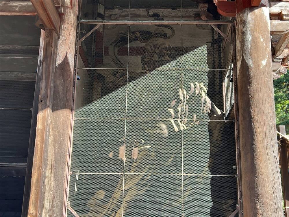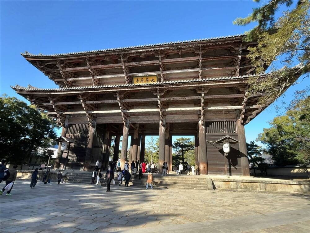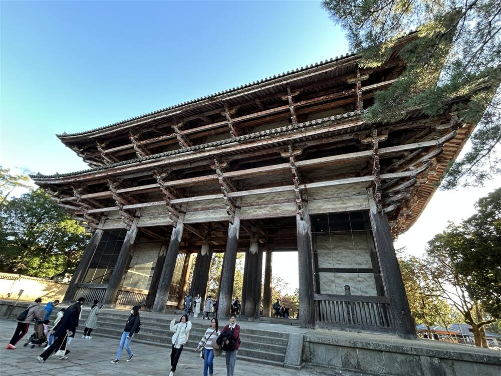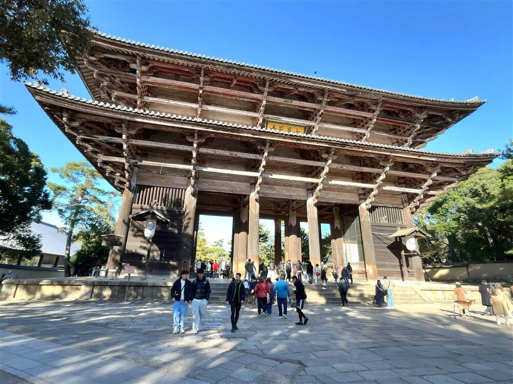 南大門は962(応和2)年8月に台風で倒壊後、鎌倉時代の1199(正治元)年に復興された。東大寺中興の祖である俊乗房重源が宋から伝えたといわれる大仏様(天竺様)という建築様式を採用した建築で、「貫」と呼ばれる柱を貫通する水平材を多用して構造を堅固にしていること、天井を張らずに構造材をそのまま見せて装飾としていることなどが特色として挙げられる。門内左右には金剛力士(仁王)像と石造獅子1対を安置する。金剛力士像は高さ8.4mの巨大な木像で、1203(建仁3)年にわずか69日で造られた。門の向かって右に吽形、左に阿形を安置しており、一般的な仁王像の安置方法とは左右逆である。制作にあたっては運慶が総指揮をとり、制作現場では運慶,快慶,定覚,湛慶らが関わっていた。