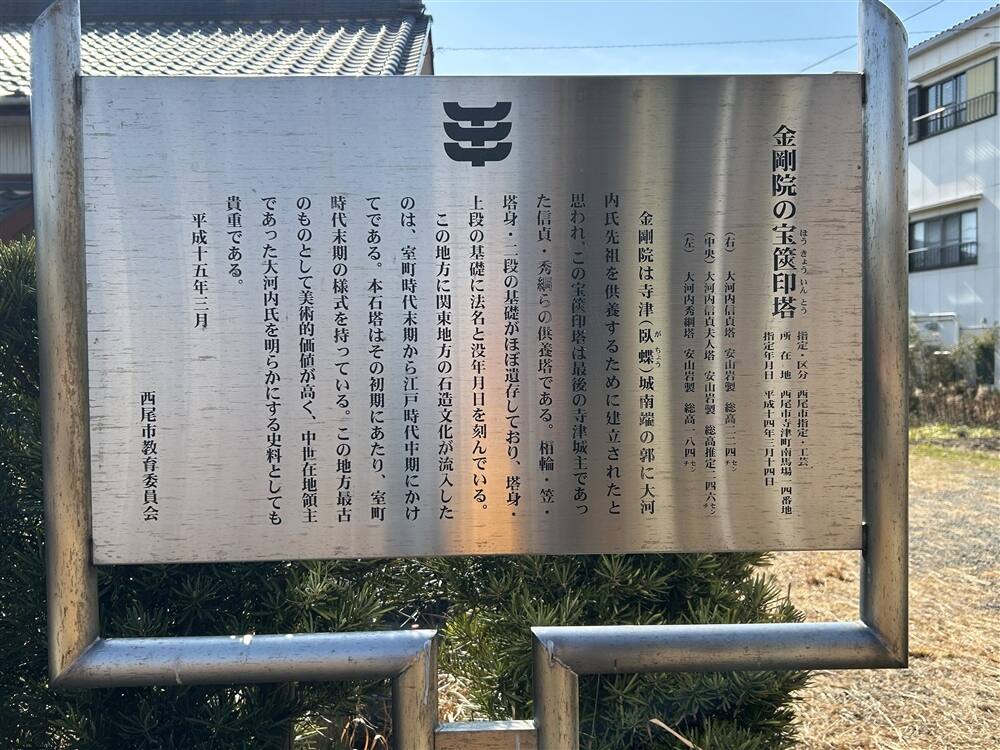 金剛院に建つ大河内信貞(1558/永禄元年没),信貞夫人(1595/文禄4年没),大河内秀綱(1618/元和4年没)の宝篋印塔形式の供養塔である。金剛院は寺津城南端の郭に先祖を供養するために建立されたと思われる大河内氏の旧菩堤寺である。