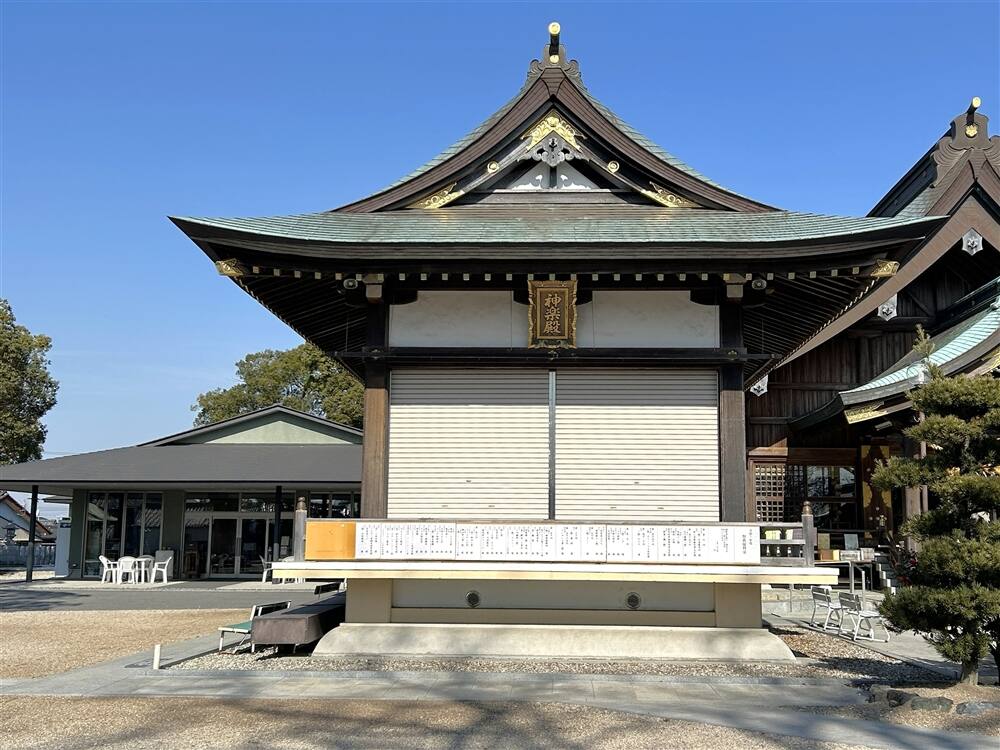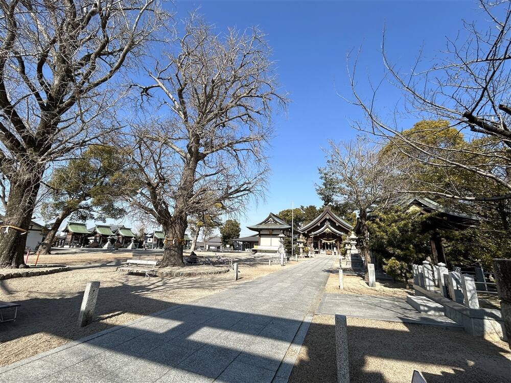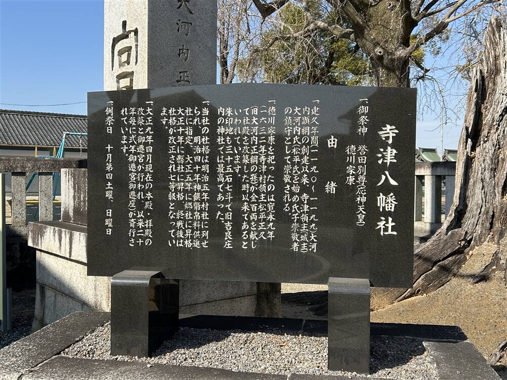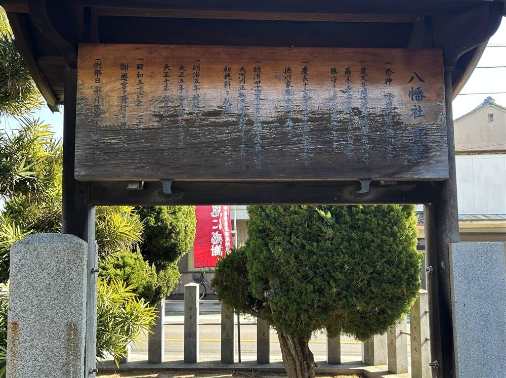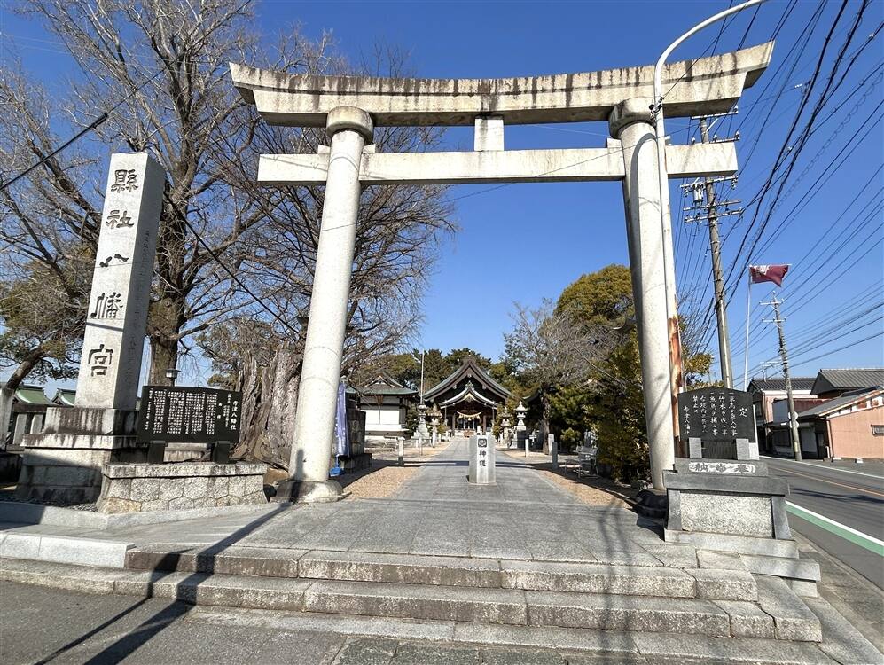境内には「大河内氏発祥地」の碑や江戸時代の国学者で神職を務めたこともある渡辺政香の「渡辺政香領徳碑」などが建つ。また、参道正面の切妻破風を用いた妻入り拝殿の扁額の「縣社八幡社」は、徳川宗家16代の徳川家達の書である。