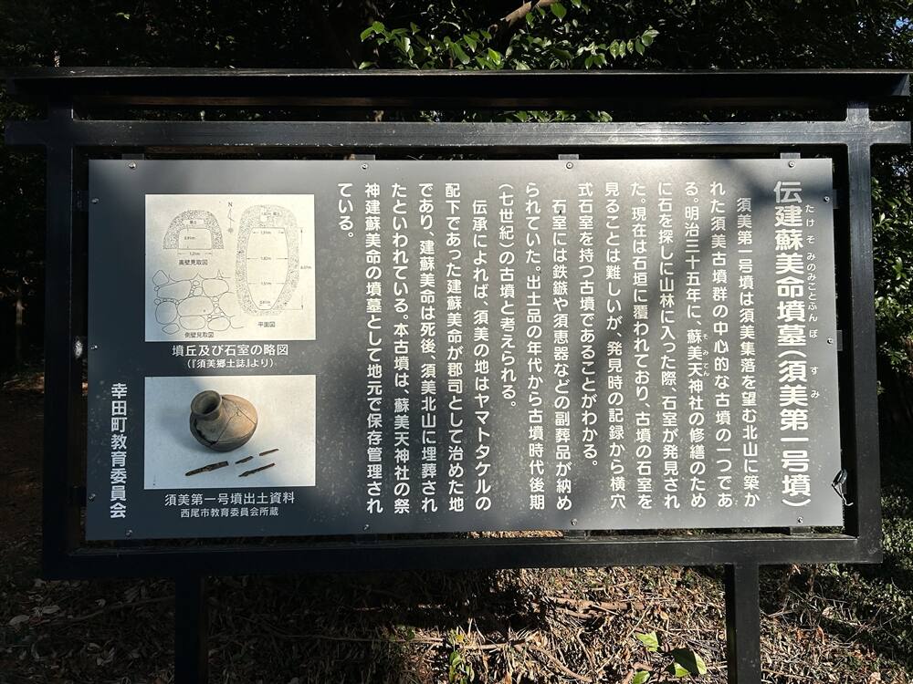 なお、当古墳は建蘇美命の墳墓と伝承されている。建蘇美命は兄弟の建津牧命(志葉都神社祭神)と父の建稲種命(宮簀媛命の兄で幡頭神社祭神)とともに日本武尊の東征に従ったといわれ、その後、この地を開拓し、死後には須美北山に埋葬されたといわれている。ただ、建蘇美命,建津牧命の名はともに系図にはみられず、後世に建稲種命と架空の2人の息子を想定し西三河南部地域の開拓の歴史をつくりあげたものと理解されている。さらに日本武尊の東征(史実とはされていないが)と須美古墳の築造年代も一致しない。