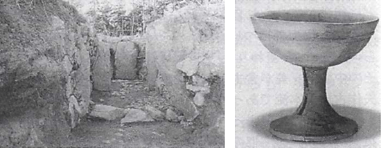 発掘時の石室入口と出土した須恵器(「岡崎市制100周年記念事業 岡崎まちものがたり」より)