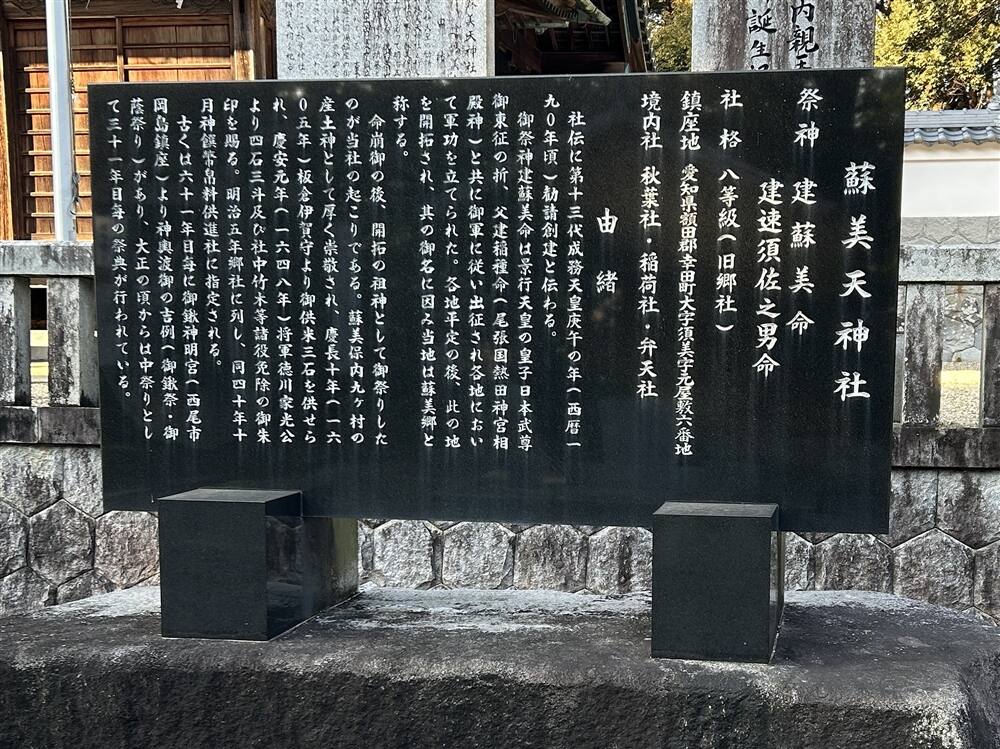 なお、この建蘇美命は、建稲種命の息子の一人として、西三河南部地域の開拓の歴史をつくりあげるうえでの伝説上の人物と理解されている(系図上に表れない)。